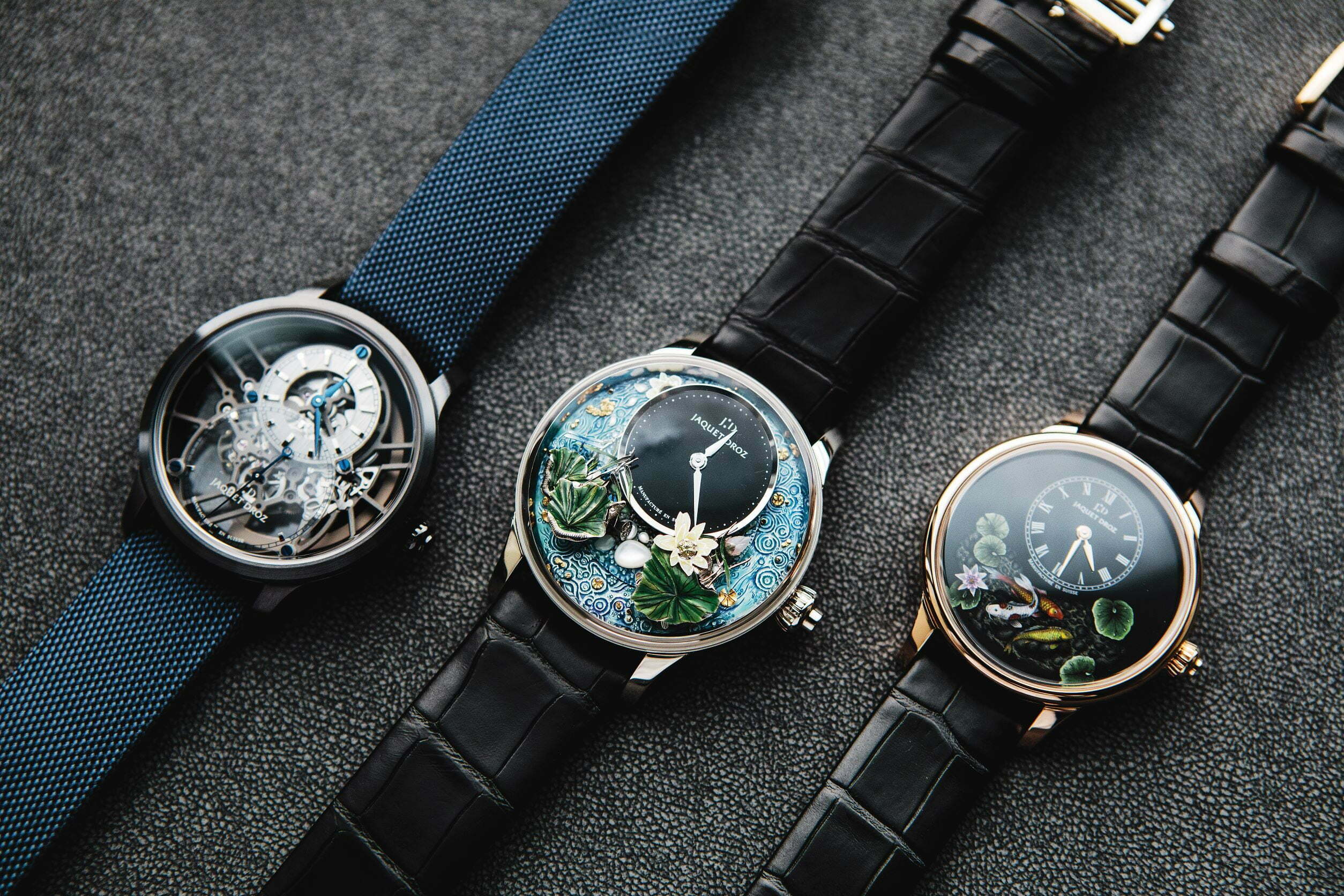 พระบาทสมเด็จพระปรมินทรมหาภูมิพลอดุลยเดชบรมนาถบพิตรบริษัทนาฬิการะดับพรีเมียมหลายแห่งมี métiers d’art ateliers ที่ซึ่งชิ้นงานอันวิจิตรงดงามทำด้วยมือ แต่มีเพียงไม่กี่คนที่สามารถสร้างผลงานศิลปะเหล่านี้ในระดับที่น่าอัศจรรย์ของ Jaquet Droz ไม่ว่าจะเป็นหน้าปัดที่ทำจากโมเสกขององค์ประกอบที่แทบจะมองไม่เห็นไปจนถึงหน้าปัดออโตเมติกที่มีชิ้นส่วนเคลื่อนไหวขนาดเล็กที่ทำให้ฉากมีชีวิตชีวาที่ประกอบไปด้วยเหล่าดอกบัวที่เปรียบดั่ง “ราชินีแห่งไม้น้ำ” เป็นพืชที่มีสีสันสวยงามให้ดอกเหนือพื้นน้ำนำมาประดับบนหน้าปัดได้อย่างงดงาม