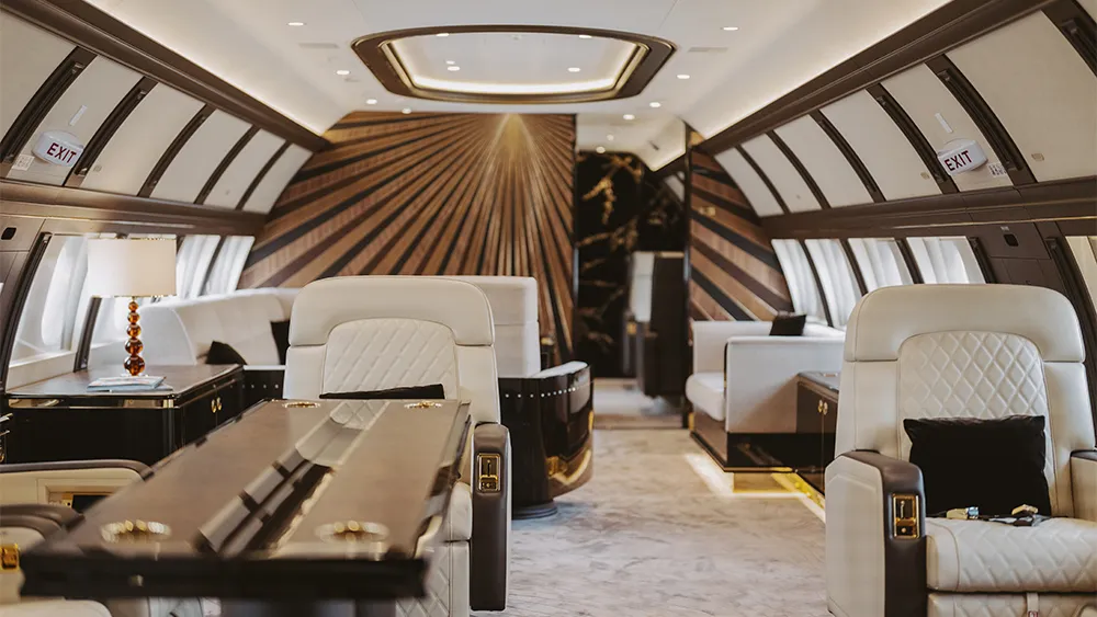 A custom aircraft interior can be inspired by anything. Take the sophisticated, moody, and detail-rich cabin of Project Thunderbird, the notion for which came from a chair. “The owner thought the available interior choices were bland, so he asked me for ideas," says London-based designer Colin Radcliffe, who started the project facing the vast, empty cabin of an ACJ319neo, which has up to 115 seats in its commercial Airbus version. Seeking a unique look, Radcliffe seized on an object his client loved: an early-20th-century Macassar-ebony chair by Émile-Jacques Ruhlmann, a leading figure of the Art Deco movement.