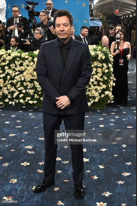 (NEW YORK, NY – May 5th, 2025) – Jimmy Fallon wore a ZEGNA made-to-measure navy-blue double-breasted wool mohair tuxedo with reverse satin lapel detail, black silk evening shirt, black silk bow-tie, and black patent leather dress shoes, at Metropolitan Museum of Art.
