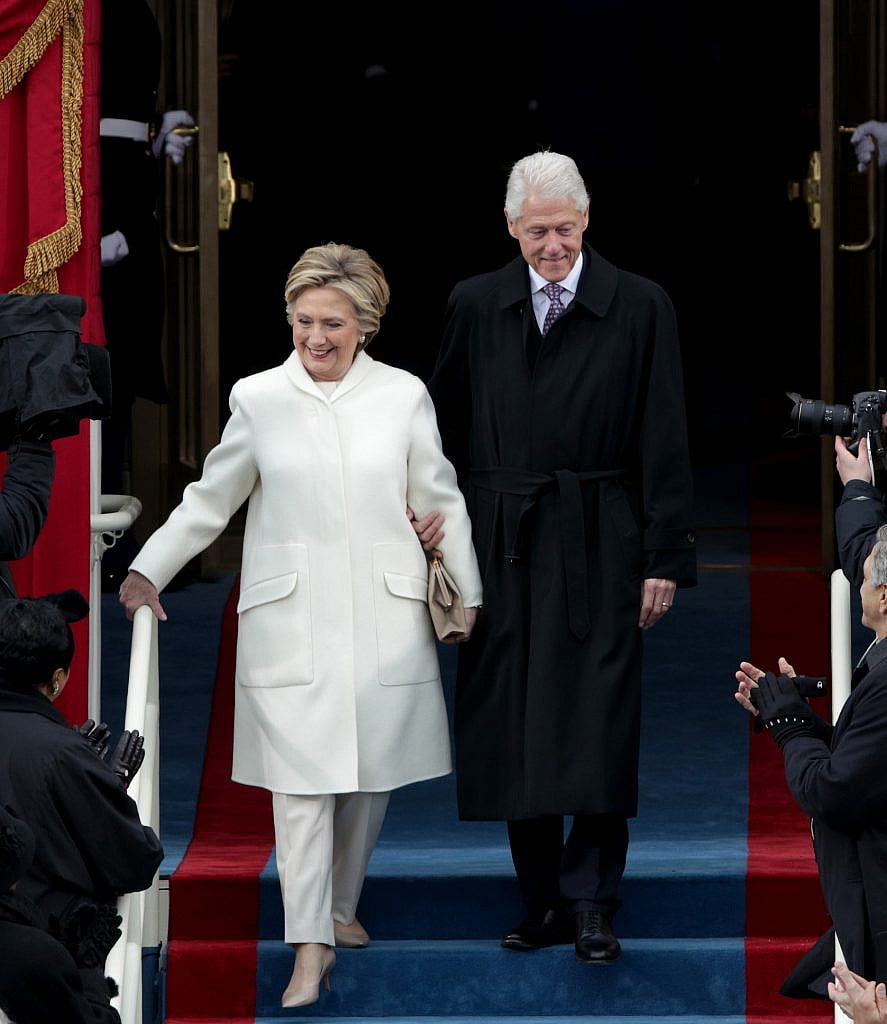 Hillary Clinton และ Bill Clinton (พรรคเดโมแครต) ที่งานสาบานตนฯ ของ Donald Trump เมื่อปี 2017 โดย Hillary ใส่ชุดสูทสีครีมจาก Ralph Lauren และก่อนหน้านี้ระหว่างเดินทางหาเสียงเธอก็ปรากฏตัวในชุดของแบรนด์อยู่บ่อยๆ เช่นกัน, Photo: Alex Wong/Getty Images