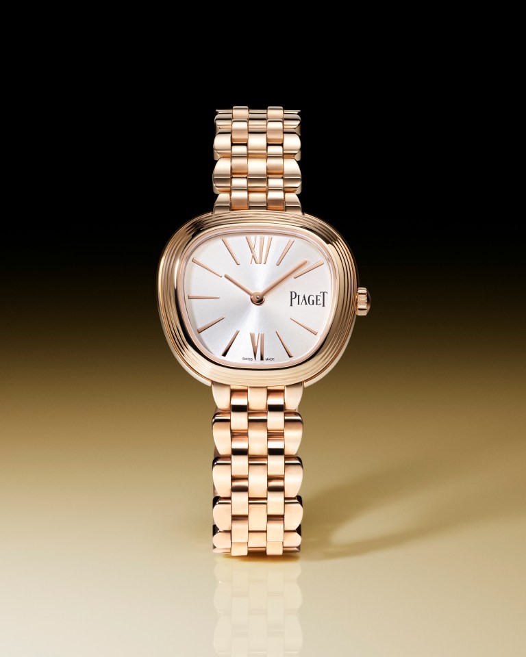 Proportions are revisited through an intense and chromatic interplay of textures: adorned with gold down to the finest details, its supple bracelet displays interlaced trapeze-shaped links that drape over the skin, suffusing it with light. The finely chiselled gadroons on the bezel proudly echo the spirit of the iconic Piaget watch owned by Andy Warhol. On its satin-finished dial, golden hour markers and baton hands blend harmoniously with the clean lines of Roman numerals. Sixtie is a little more than just a watch: it is a jewellery watch displaying subtle extravagance, an accessory that is eloquently discreet, defying traditional proportions and convention. Either worn on its own or with other everyday treasures, Sixtie gives time a new shape, embodying an alternative form of elegance exclusively for women in the know. Its asymmetrical rounded shape epitomises timelessness and the act of going against the tide, with a unique beat: a movement that reveals the unsuspected with every second.