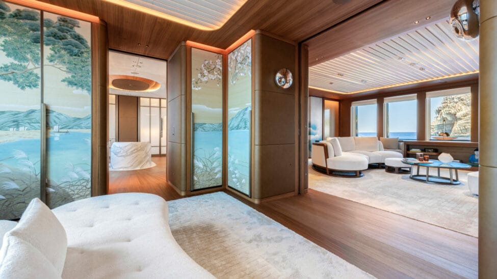 The elaborate owner’s suite has four interconnecting sections with silk-embroidered panels in the dressing chamber, plate-brass doors between the living room and bedroom, and a bath sculpted from a single block of Carrara marble. Throughout the yacht, luminescent jellyfish, flamingos, and abalone drawings in various rooms nod to an overarching marine theme, while on the sundeck, a skylight and a glass-fronted Jacuzzi add sociability.