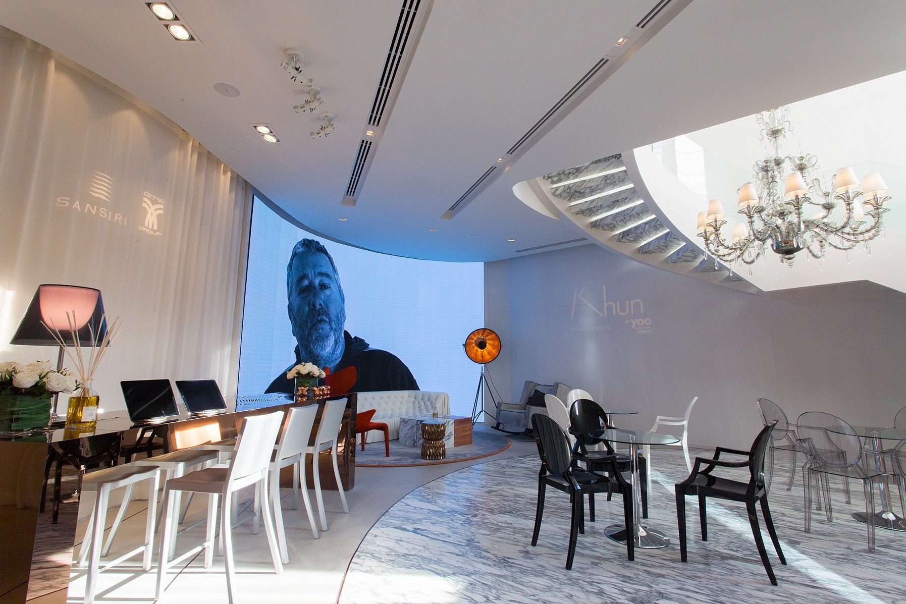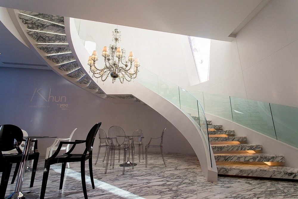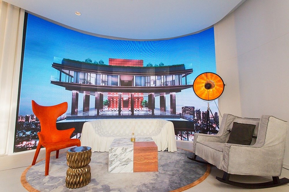 A curved staircase reveals the second floor of the sales gallery, stunning with its picture of a very big city. An imitation of KHUN by YOO inspired by Starck lets visitors see the condominium’s details more clearly, with its 27 floors and 148 lavish private rooms. The top floor is used for recreational purposes, with a swimming pool that opens to a panoramic view of the city and a convenient, modern exercise zone.