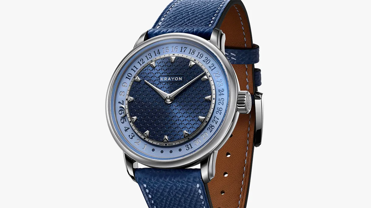 The light-blue date display along the periphery of this dial also indicates days of the week by differentiating between weekdays (displayed in navy blue) and weekends (a lighter shade of blue). It’s the first mechanical watch to cover an entire month at a glance. The blue dial is guilloched in Krayon’s signature Y pattern, and the 39 mm case is 18-karat white gold. It comes with a blue-grained calfskin strap to match. This beauty retails for CHF 88,000 (about $100,000).