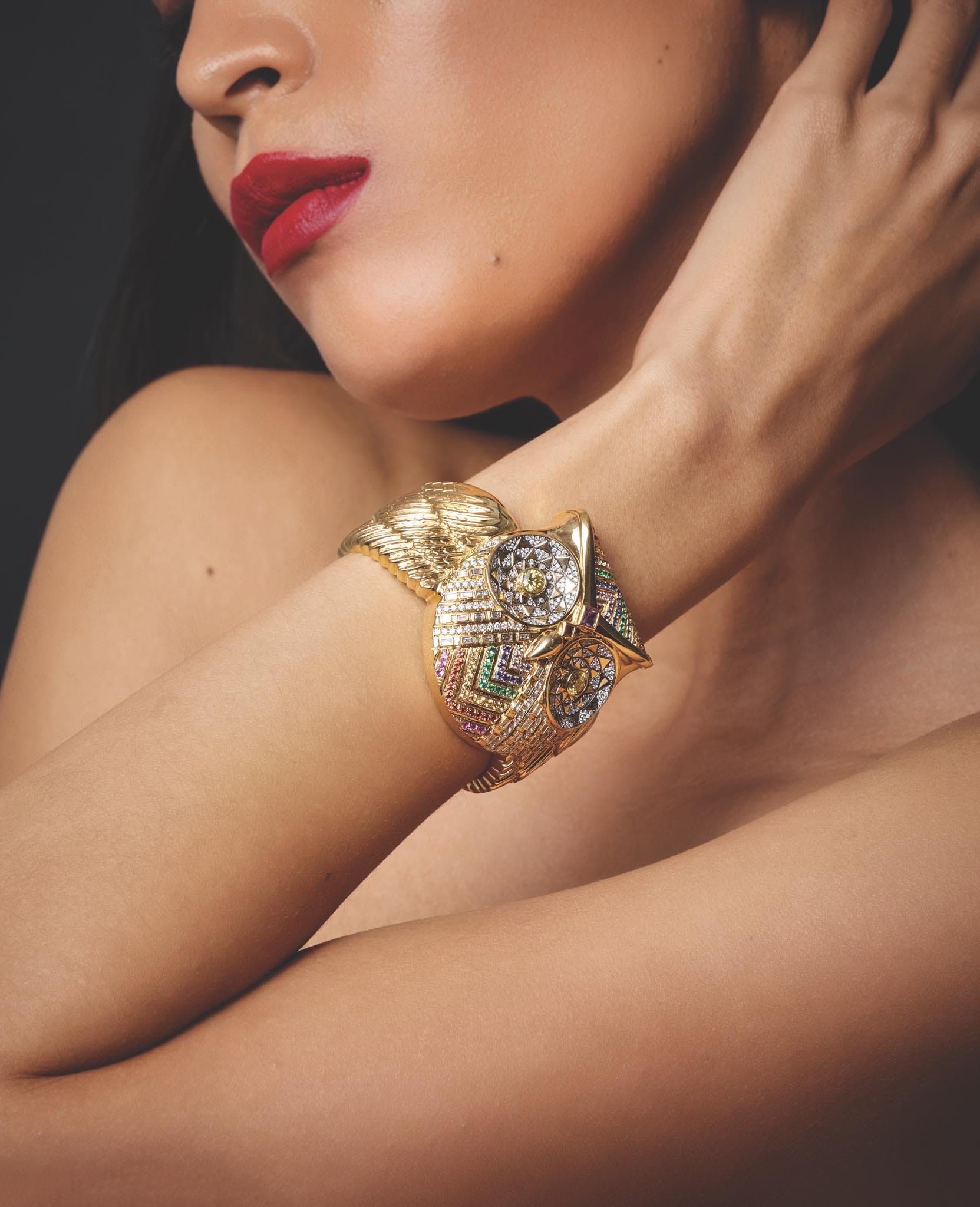 Lauren Harwell Godfrey ไม่คิดว่าเครื่องประดับหรูๆ ควรจะจริงจังขนาดนี้เสมอไป ได้นำคอลเลกชั่น Menagerie ของเธอ ซึ่งมีอัญมณีรูปสัตว์แปดชิ้นที่มีเอกลักษณ์เฉพาะตัว ที่มีจิตวิญญาณแห่งความสนุกสนานส่องประกายผ่านข้อมือนกฮูกที่เห็นได้ที่นี่ พร้อมด้วยแซฟไฟร์และเพชรนับร้อยเม็ด