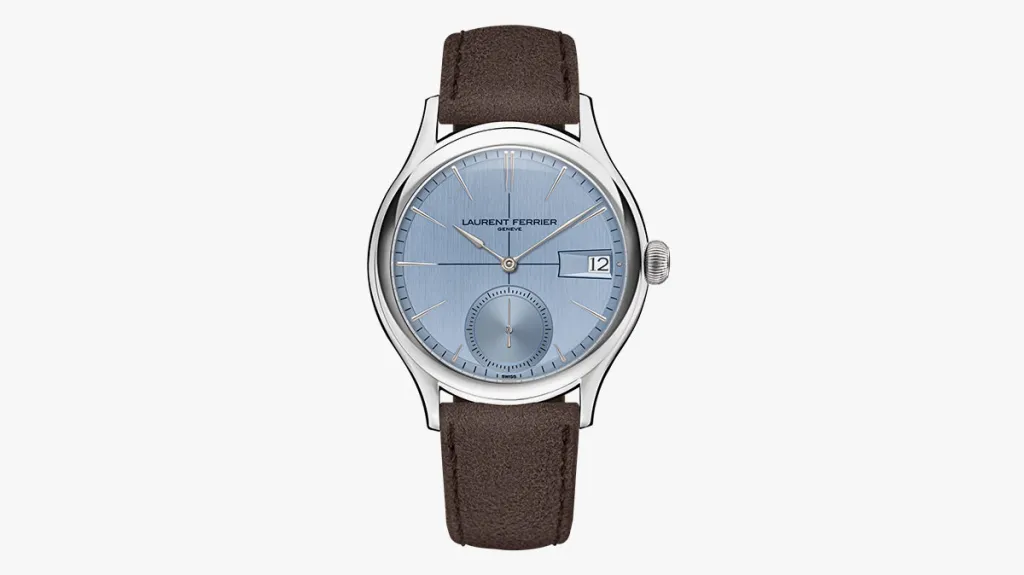 Joining Laurent Ferrier’s lineup is a fresh version of the Classic Auto with a horizon-blue dial. Unlike the previous copper-toned dial Serie Atelier version, this iteration is part of the brand’s permanent collection, allowing more collectors a chance to get their hands on one. Housed in a 40 mm round stainless steel case inspired by pocket watches, it features a handsome dial whose sky-blue shade is achieved via a translucent lacquer coating applied to a base treated with a silver galvanic layer. The vertically satin-brushed finish is divided by a subtle crosshair pattern, while the minute track features a circular satin-brushed effect.