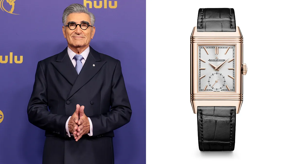Levys แสดงให้เห็นถึงรสนิยมอันไร้ที่ติของเขาอีกครั้งในงาน Emmy โดย Dan สวมชุด Loewe ที่โดดเด่นและ Eugene สวมชุดสูทคลาสสิกพร้อมนาฬิกา Jaeger-LeCoultre ที่เก๋ไก๋ Reverso Tribute Monoface Small Seconds พร้อมกับเคสโรสโกลด์ขนาด 45.6 มม. และหน้าปัดซันเรย์สีเงิน ด้านหลังสามารถปรับแต่งได้ด้วยวันที่ ลาย เลขย่อ ฯลฯ นาฬิการาคา 22,700 ดอลลาร์นี้ยังมาพร้อมกับสายรัดสองสายที่สามารถสับเปลี่ยนกันได้ ช่วยให้ผู้สวมใส่สามารถเปลี่ยนสไตล์ได้ตามต้องการ