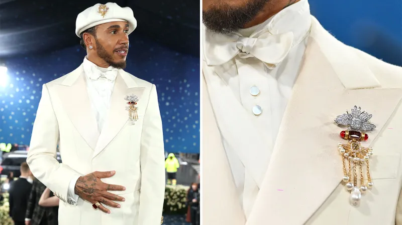 Among a sea of bold looks, the British race car driver and Met Gala co-chair brought a quieter elegance in a white custom Wales Bonner tuxedo. But it was a vintage pearl-and-diamond brooch on the lapel and a vintage Briony Raymond floral brooch made of white, yellow, and pink diamonds on Hamilton’s custom Stephen Jones hat that truly made it dandy.