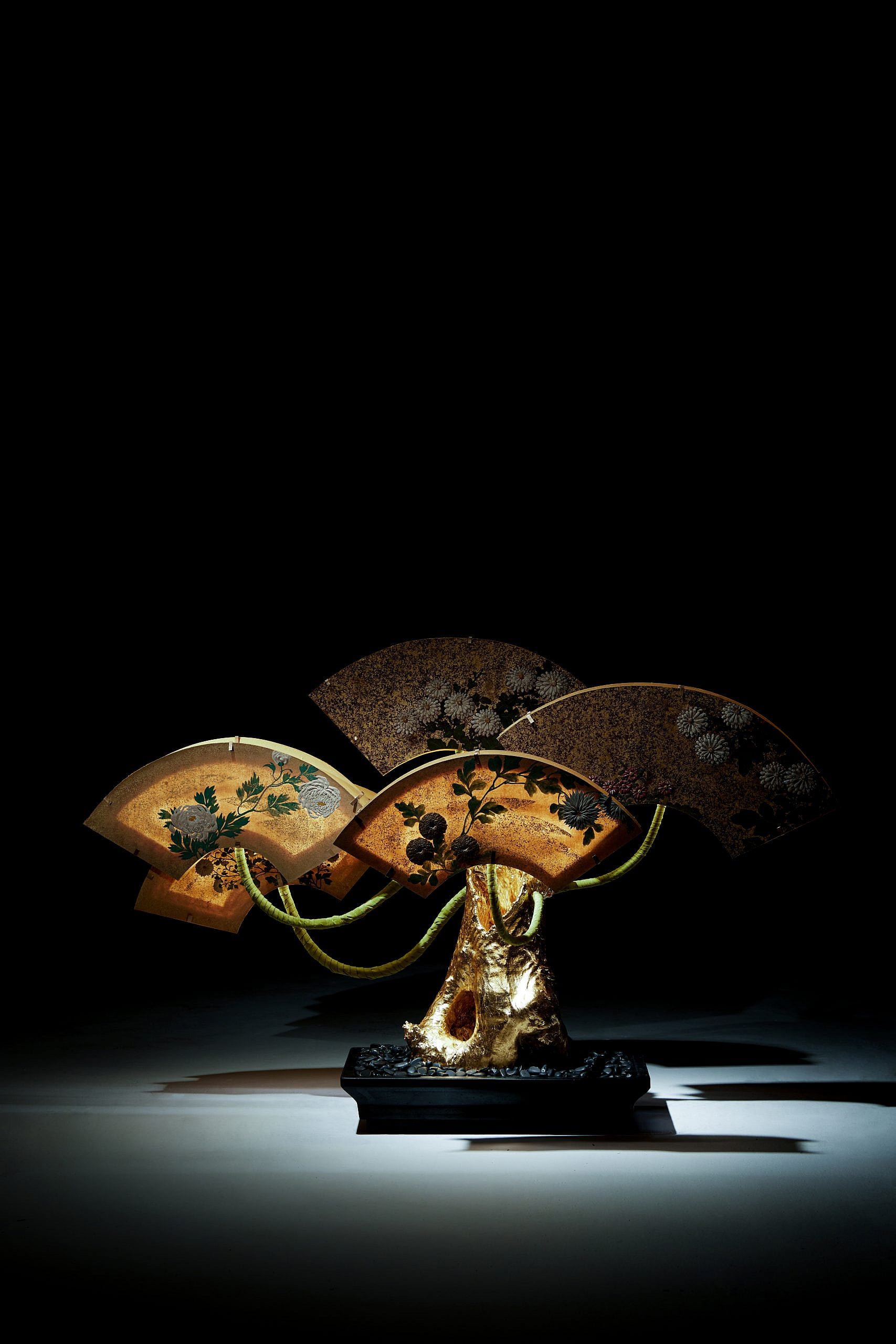 โคมไฟต้นบอนไซ ประดับใบด้วยพัดญี่ปุ่นโบราณวาดลายจากต้นศตวรรษที่ 19 ลำต้นของบอนไซแต่งสีทองตั้งอยู่บนกระถางสีดำ มาพร้อมอรรถประโยชน์ที่สามารถประดับเป็นงานศิลป์ตกแต่งบ้านในช่วงเวลากลางวัน และสามารถใช้เป็นโคมไฟส่องสว่างสร้างบรรยากาศแห่งความหรูหราในยามค่ำคืน โคมไฟชิ้นนี้ต้องใช้เวลารังสรรค์ขึ้นใหม่เป็นเวลาถึง 1.5 เดือนรวมระยะเวลา ตั้งแต่ขั้นตอนในการออกแบบงานศิลป์จนถึงการผลิตชิ้นงานจนเสร็จสมบูรณ์ ด้วยความร่วมมือของนักออกแบบและช่างชั้นครูถึง 9 คนด้วยกัน