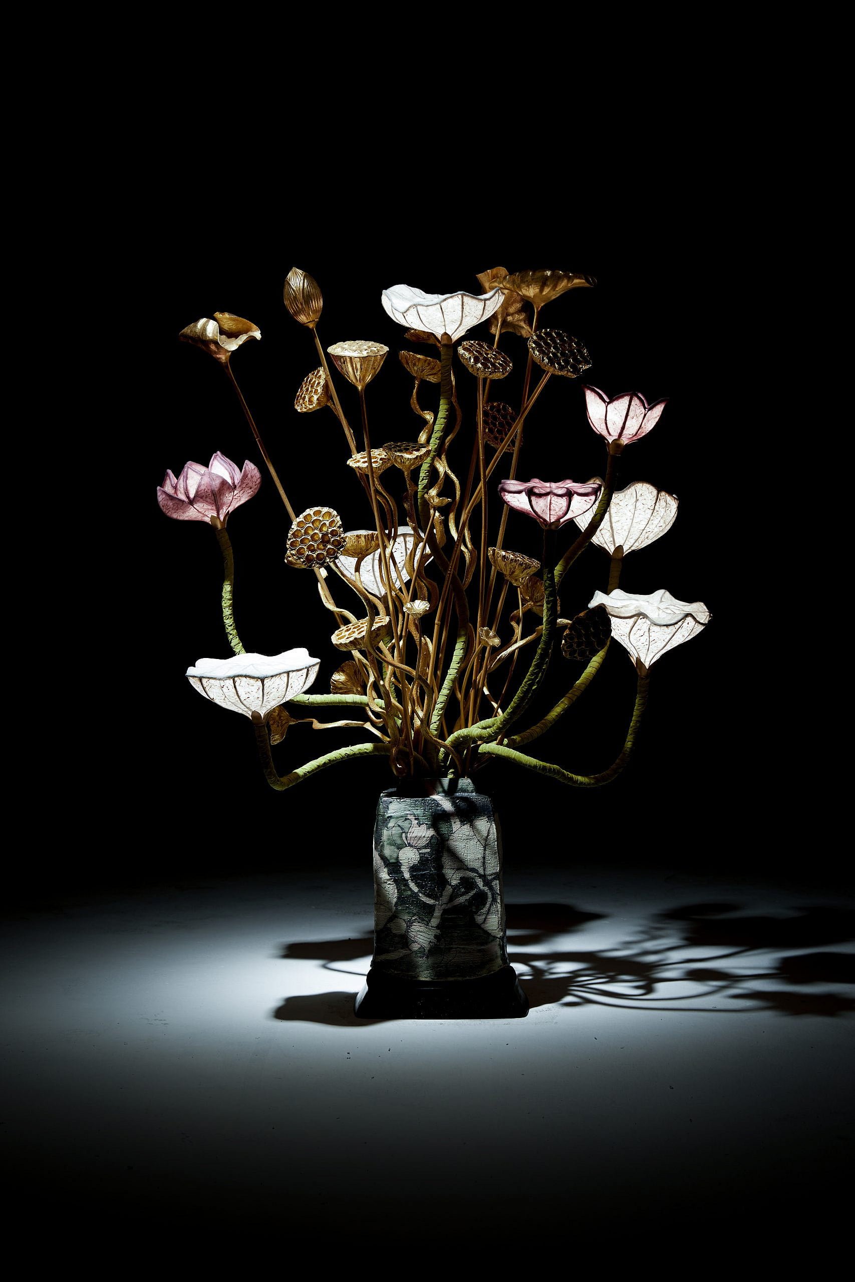 โคมไฟใบบัวที่จะสะกดทุกสายตา ประดับในแจกันดินเผาเพ้นท์สีและวาดลวดลายบนพื้นผิวให้กลมกลืนกับดีไซน์ของใบบัว ดอกบัวมีสองรูปแบบคือดอกบัวแห้งระสีทองทั้งดอกและก้าน ในขณะที่อีกแบบเป็นดอกบัวที่หุ้มด้วยกระดาษสาบนก้านทองเหลืองหุ้มด้วยผ้า เป็นโคมไฟให้แสงสว่างในช่วงค่ำคืนและเปลี่ยนเป็นชิ้นงานศิลปะประดับบ้านในเวลากลางวันโคมไฟชิ้นนี้ใช้เวลารังสรรค์เป็นเวลากว่าเดือนครึ่ง ตั้งแต่ขั้นตอนในการออกแบบงานศิลป์จนถึงการผลิตชิ้นงานจนเสร็จสมบูรณ์ ด้วยความร่วมมือของนักออกแบบและช่างชั้นครูกว่า 9 คนด้วยกัน