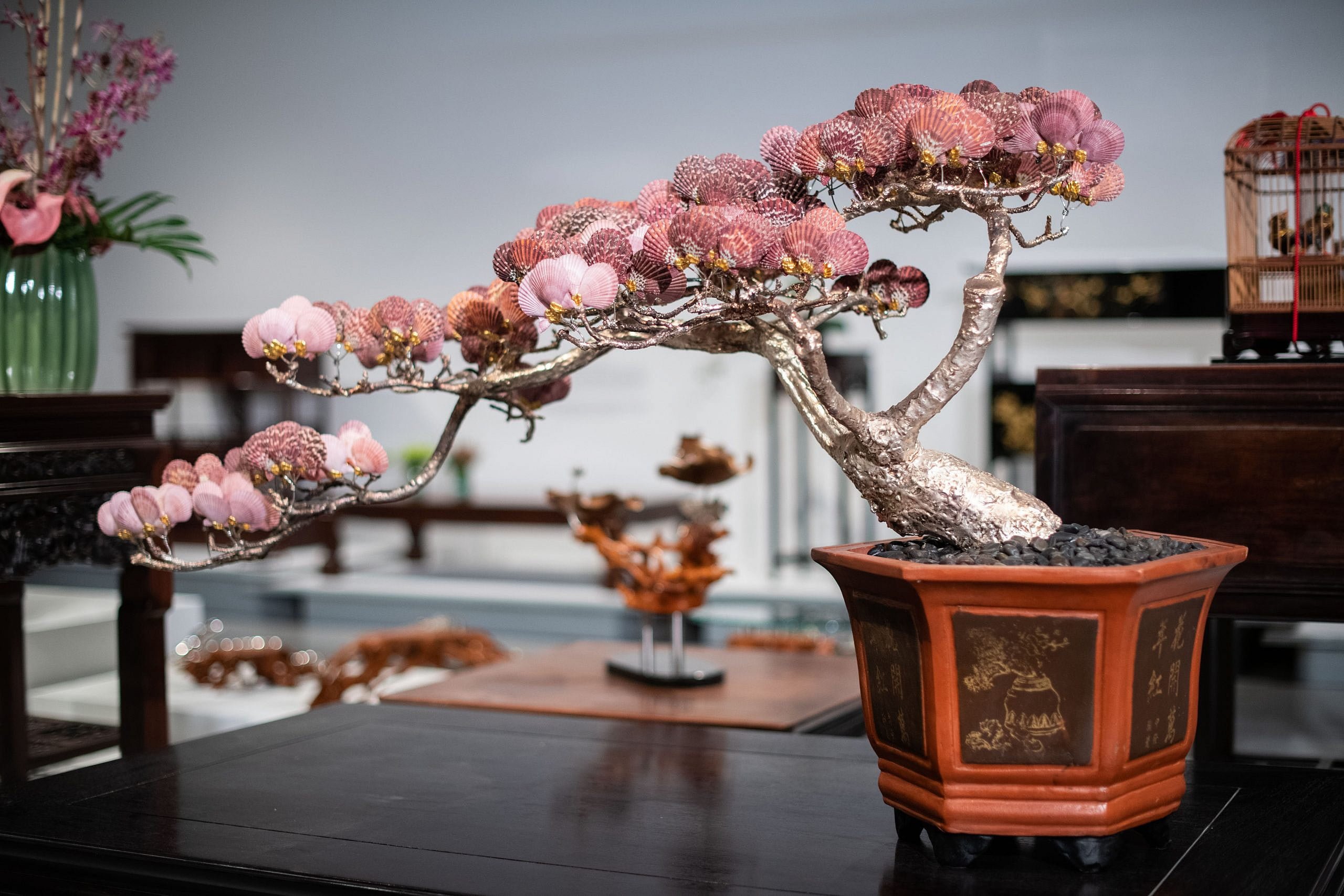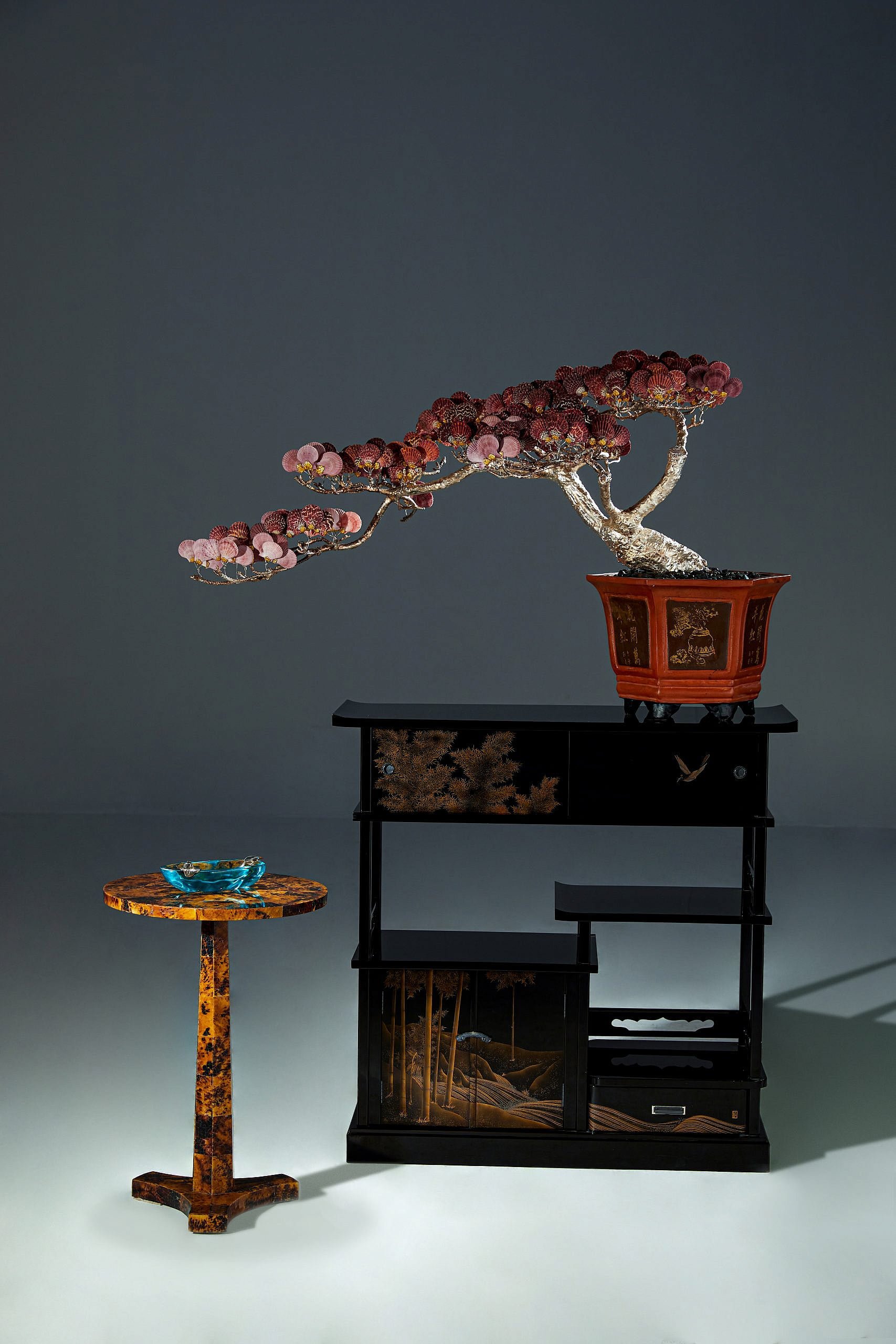 ต้นบอนไซที่ผลิใบด้วยเปลือกของหอยเชลล์ งานฝีมือสุดประณีต ในขณะที่ลำต้นรังสรรค์ขึ้นจากเงินสเตอร์ลิง ในกระถางสไตล์ญี่ปุ่น ผลงานชิ้นนี้ใช้เวลาในการชุบชีวิตให้กลายเป็นต้นไม้อันงดงามด้วยงานศิลป์กว่า 6 เดือน ด้วยฝีมือของนักออกแบบและช่างฝีมือมากทักษะและประสบการณ์กว่า 20 ชีวิต
