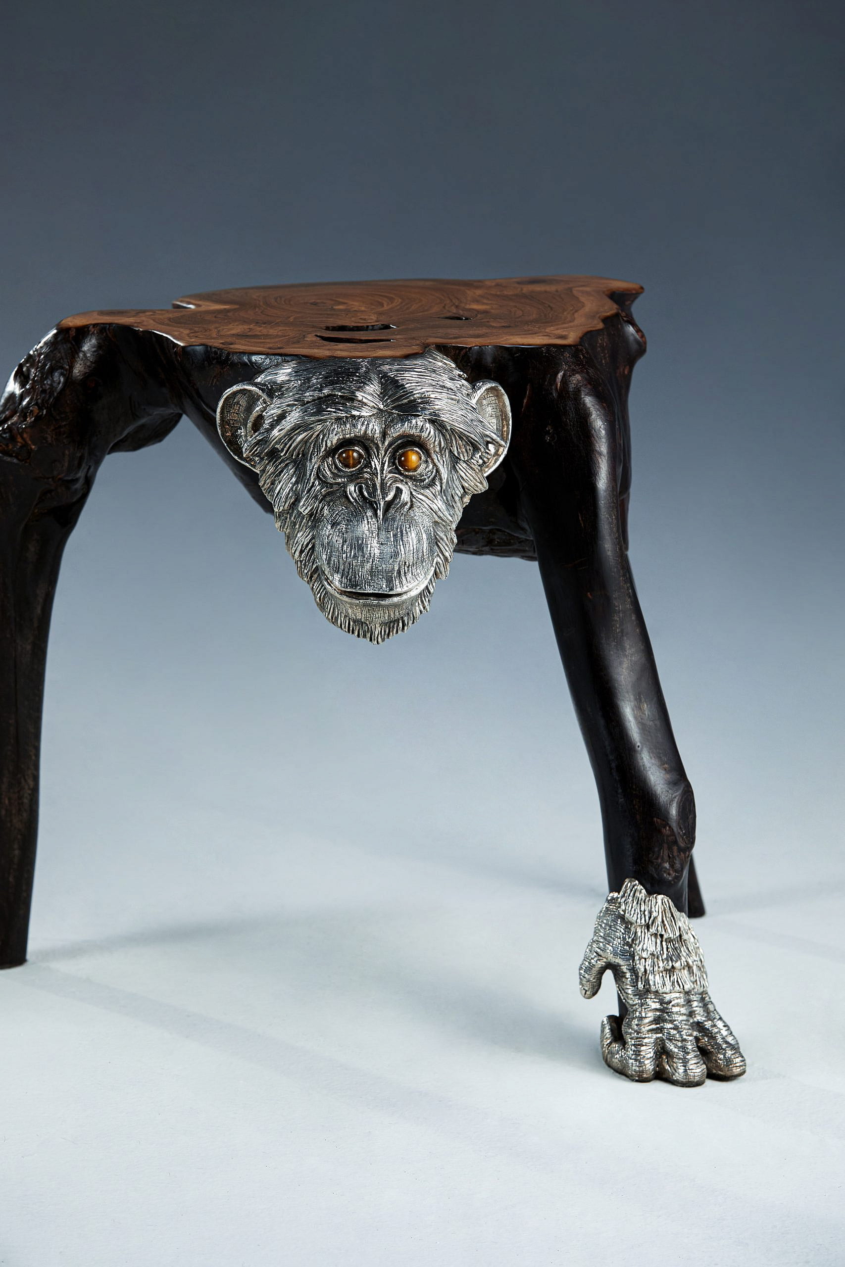ชิ้นงานศิลป์จากไม้ Box Wood ในรูปทรงดั้งเดิมจากธรรมชาติ ถูกนำมาออกแบบใหม่และประดับด้วยเงินสเตอร์ลิง ก่อกำเนิดเป็นชิ้นงานศิลป์ของลิงชิมแปนซี ที่สามารถใช้เป็นงานประติมากรรมประดับบ้าน หรือจะปรับให้เป็นโต๊ะ coffee table แบบเตี้ยเพื่อการใช้งานในชีวิตประจำวัน ทรงคุณค่าน่าสะสมเพราะหลังจากที่ต้องใช้เวลาค้นหาและคัดสรรไม้ Box Wood ที่มีรูปทรงสวยงามตามธรรมชาติอย่างยาวนานแล้ว จะต้องนำมารังสรรค์ใหม่อย่างพิถีพิถันโดยใช้เวลานานถึง 10 สัปดาห์ ด้วยฝีมือของนักออกแบบและช่างฝีมือผู้เชี่ยวชาญถึง 8 ชีวิต
