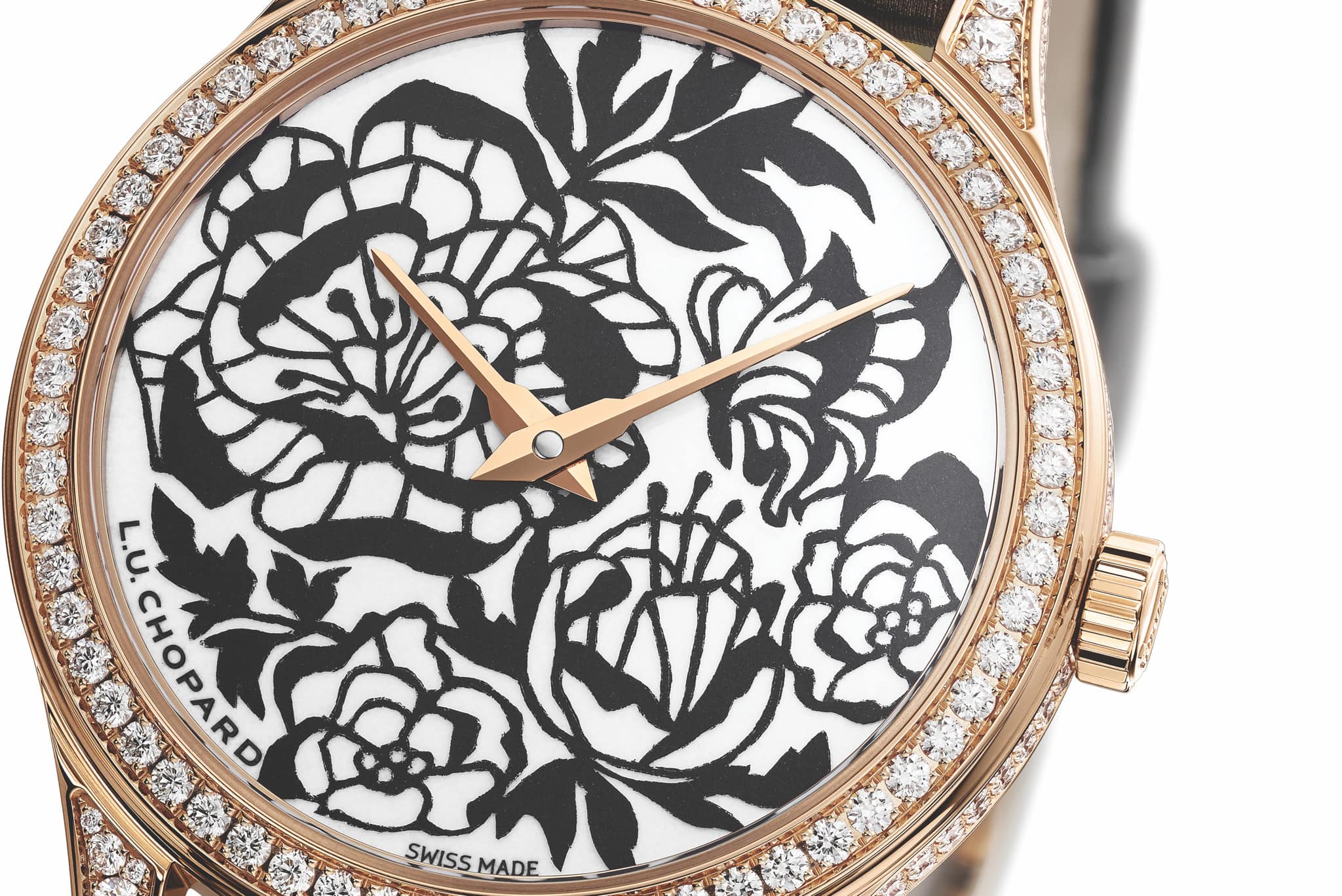 L.U.C XP Esprit de Fleurier Peony เป็นรุ่นลิมิเต็ดเอดิชั่นแปดชิ้นมาพร้อมลวดลายดอกไม้อันละเอียดอ่อน Chopard อาศัยงานฝีมือแบบดั้งเดิม รวมถึงศิลปะการตัดกระดาษที่รู้จักกันในชื่อ Scherenschnitte เพื่อสร้างลวดลาย ลวดลายดอกโบตั๋นที่มาจากประเทศจีน ซึ่งเป็นดอกไม้ที่ผลิบานในฤดูใบไม้ผลิแทนสัญลักษณ์ของความเจริญรุ่งเรืองและเกียรติยศ Chopard จับภาพความงามของพวกเขาไม่เพียงแต่บนหน้าปัดเท่านั้น แต่ยังรวมถึงการเคลื่อนไหวจากเข็มนาฬิกาสีโรสโกลด์ 18 กะรัต ที่มองเห็นผ่านตัวเรือนด้านหลังด้วยเทคนิคการแกะสลักที่ซับซ้อนโดยมีชื่อเรียกว่า Fleurisanne