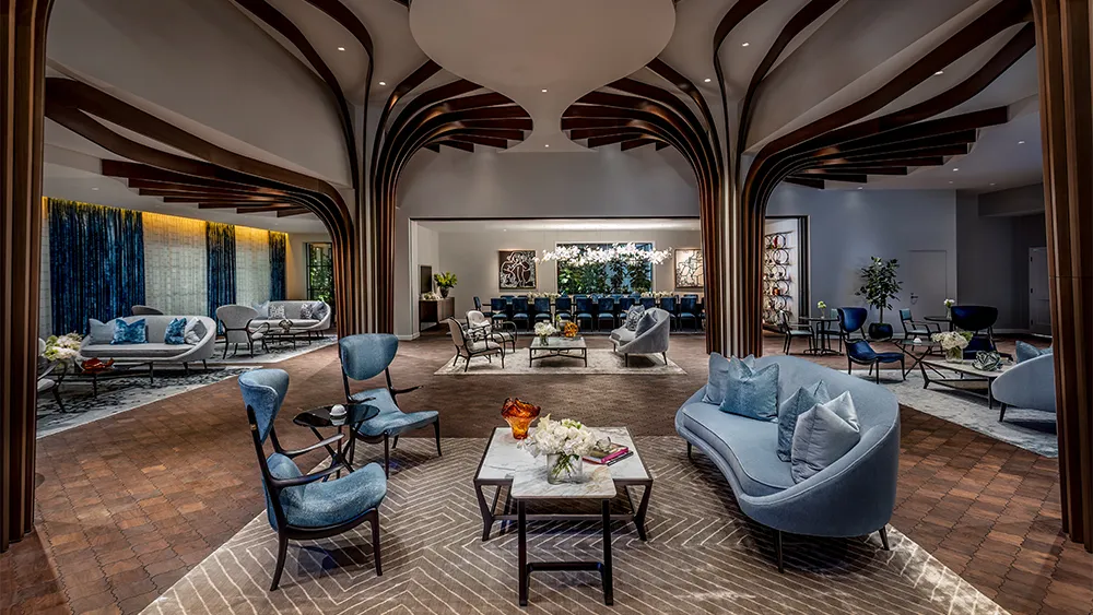 Just a short drive from its Newport Beach headquarters and the deep-blue waters of the Pacific Ocean, California-based jeweler Lugano’s club concept has recently opened next door to its flagship boutique in the area’s upscale Fashion Island district. Through a pair of discreet glass doors accessible via the showroom (as well as street-side), Privé is a 7,500-square-foot members-only space that features Italian furniture from Ceccotti Collezioni and Poltrona Frau, an indoor-outdoor garden area of flowers and greenery, and striking wooden columns that spread outward, onto the ceiling, in a treelike effect.