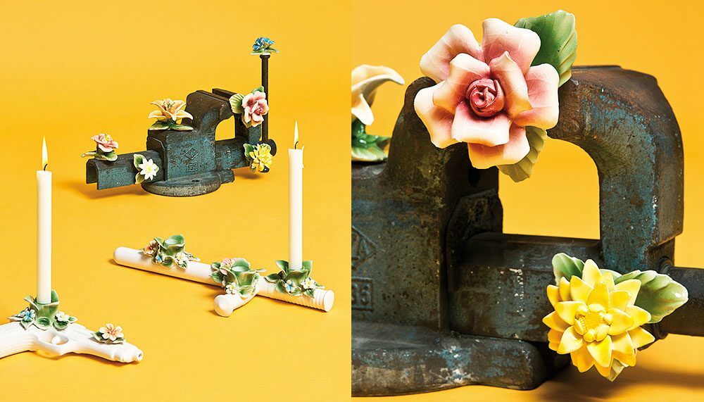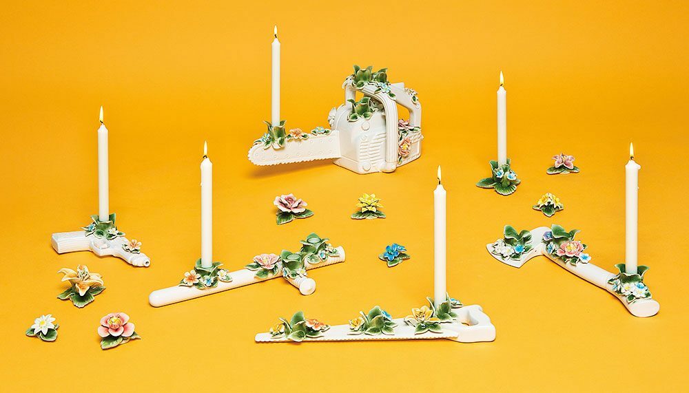We’re sure you won’t find these pieces in grandmother’s precious porcelain collection. Capodimonte porcelain is given a tongue-in-cheek twist by quirkmeister Seletti, which also presented bookshelves resembling Renaissance buildings, and a cosmos-inspired tableware collection that utilised glass and copper to stunning effect. One of Italy’s most enduring and popular forms of art, Capodimonte porcelain is known for its bucolic subjects of decorative flowers, dainty fairies and pastoral scenes. Collaborating with designer Marcantonio Raimondi Malerba, Seletti upends this convention with its Flower Attitude collection, which takes symbols of violence – hatchets, chainsaws, guns and truncheons – and adorns them with the pretty flowers in soft colours so beloved of Italian nonnas. The collection suggests various subtexts – on one level it recalls Bernie Boston’s famous 1967 image of a young anti-war demonstrator tucking a carnation in a soldier’s rifle barrel. Ultimately, however, it offers an uneasy contrast of homely treasures with an undercurrent of violence, a creative juxtaposition that Seletti excels in.