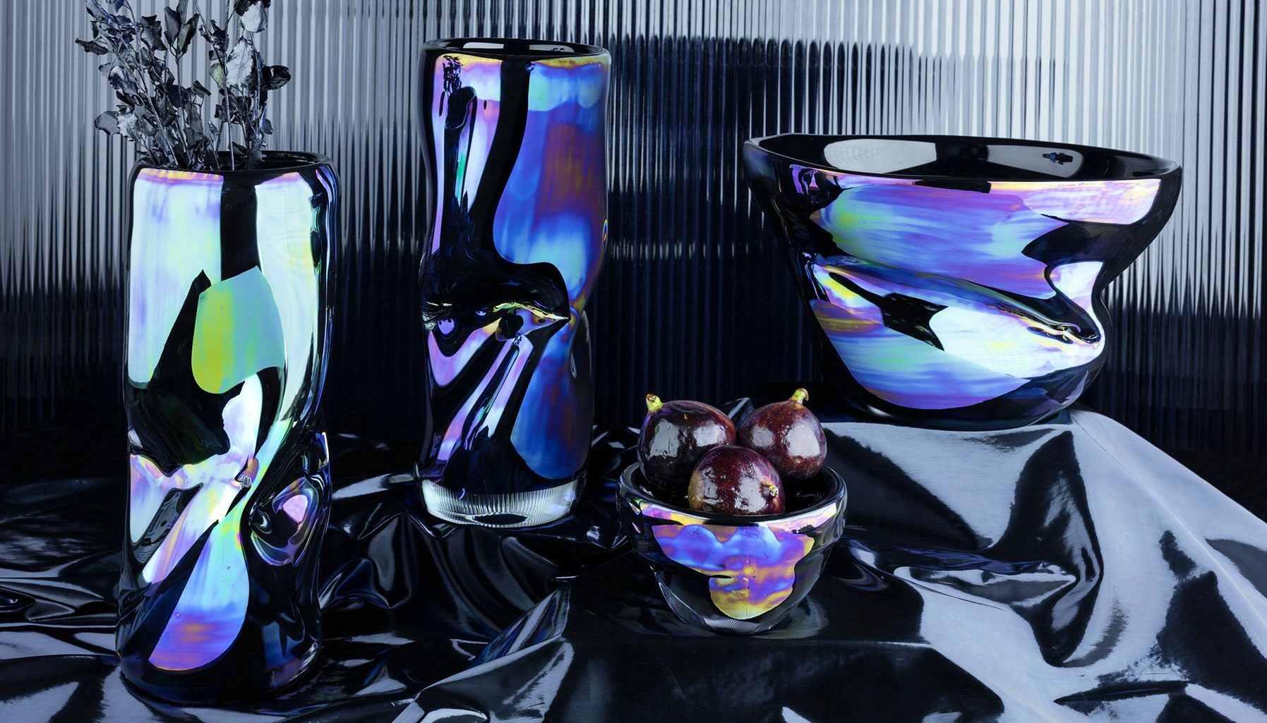 Warp comprises opulent vases and bowls that are formed from a mouth-blown cylinder which is distorted while the glass is in a molten state. The iridescent finish is then applied by hand and the vessel refired at a high temperature. Each hand-shaped piece reflects the lustrous glaze differently from the others.