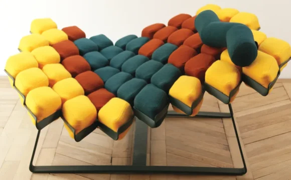 Newly reissued by Ligne Roset, Pierre Charpin’s 1998 cult hit is whatever you want it to be. Playful in its use of form and colour, Slice simultaneously demonstrates an unmistakable rigour and precision in its pared-down design and construction. The main chair is upholstered over a wood and foam structure with green fabric across its slightly angled back, with yellow fabric across its seat and arms and red on its front. Rectangular footstools with similar rounded corners in a variety of blue hues can be added to this or removed. Users can arrange the modules to create a club chair, extended chaise lounge or even link two chairs together using the footstools.
