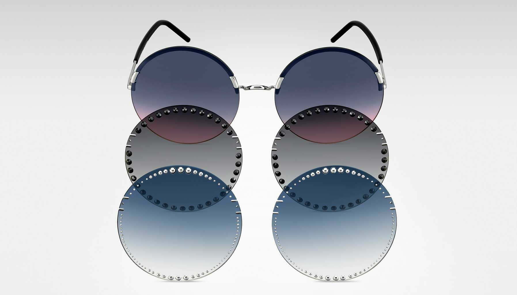 The 1970s are having a renaissance on the runways and these round-framed sunglasses are the simplest method to buy into the trend. Each pair comes with three interchangeable lenses: one with a blue/coral gradient, one embellished with Swarovski crystals and for a hint of rebellion, and one with studded detailing. One pair of sunglasses and three very different looks – cool, classy and crystalline.