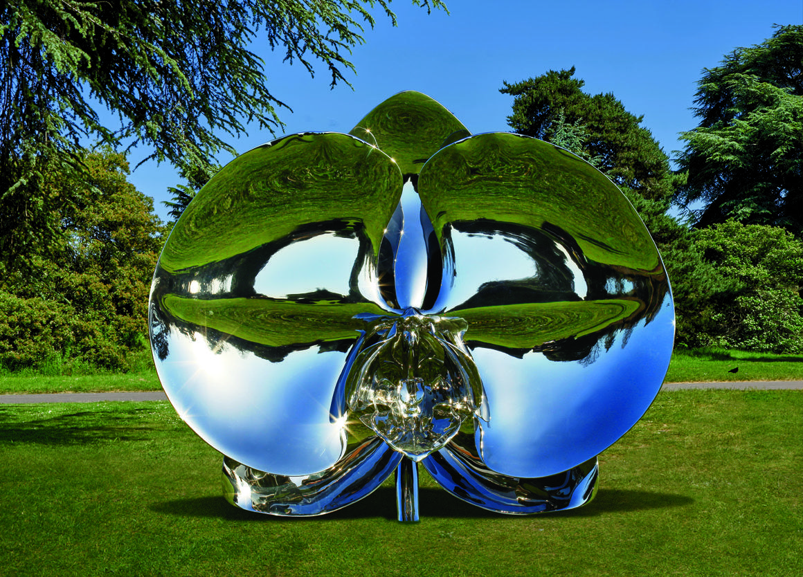 หลายชิ้นในบรรดาประติมากรรมที่จะประดับสวน ล้วนทำจากสแตนเลสขัดเงา สะท้อนทั้งภาพภูมิทัศน์และผู้ชมไว้ในกลีบดอกและใบประดับที่เหมือนกระจกเงา ภาพสะท้อนที่บิดเบี้ยวเหล่านี้จะเปลี่ยนแปลงไปตลอดเวลาตามสภาพอากาศ เวลา และผู้คนที่เดินผ่านไปมา มองจากด้านข้าง ชิ้นงานเหล่านี้มีความกว้างเพียงไม่กี่นิ้ว อาจมองไม่เห็นได้ง่าย “ผมอยากให้มันเป็นเหมือนสิ่งที่มองเห็นได้แต่ไม่เด่นชัด" เขากล่าว แต่เมื่อมองเห็นชัดๆ มันก็คล้ายกับหน้าจอที่อยู่ทั่วไปในชีวิตของเรา ในห้องสีขาว พวกมันคงจะว่างเปล่า แต่ที่คิว พวกมันจะกลับมีชีวิตชีวาด้วยเวลาและสถานที่ “มันแปลกประหลาดและเหมือนหลุดออกมาจาก Alice in Wonderland ในแง่หนึ่ง" เขากล่าวเสริม