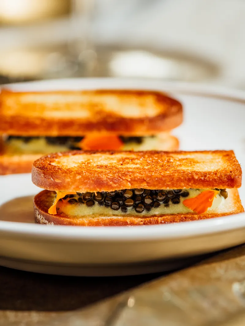 If you want to go big, the Marigold Club has got you covered. The latest restaurant from the Goodnight Hospitality team (led by the master sommelier June Rodil) has taken its French and British inspirations to the extreme. There’s seafood towers, caviar sandwiches, bespoke sundae carts, and oyster-and-Champagne combos. (Lighter options abound just as well—take the scallop crudo with Meyer lemon chutney, or a lightly fried shellfish and green beans that plays on the classic fish and chips.) The décor is just as sumptuous, with green-velvet upholstered ceilings and hand-painted murals that nod to the iconic Bemelmans drawings at the Carlyle. It’s a complete delight for the senses.