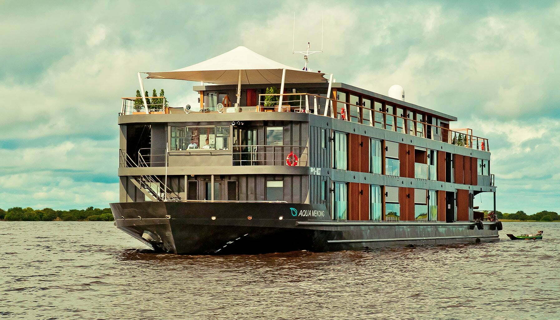 When we pull up alongside the river I don’t notice the Aqua Mekong at first.