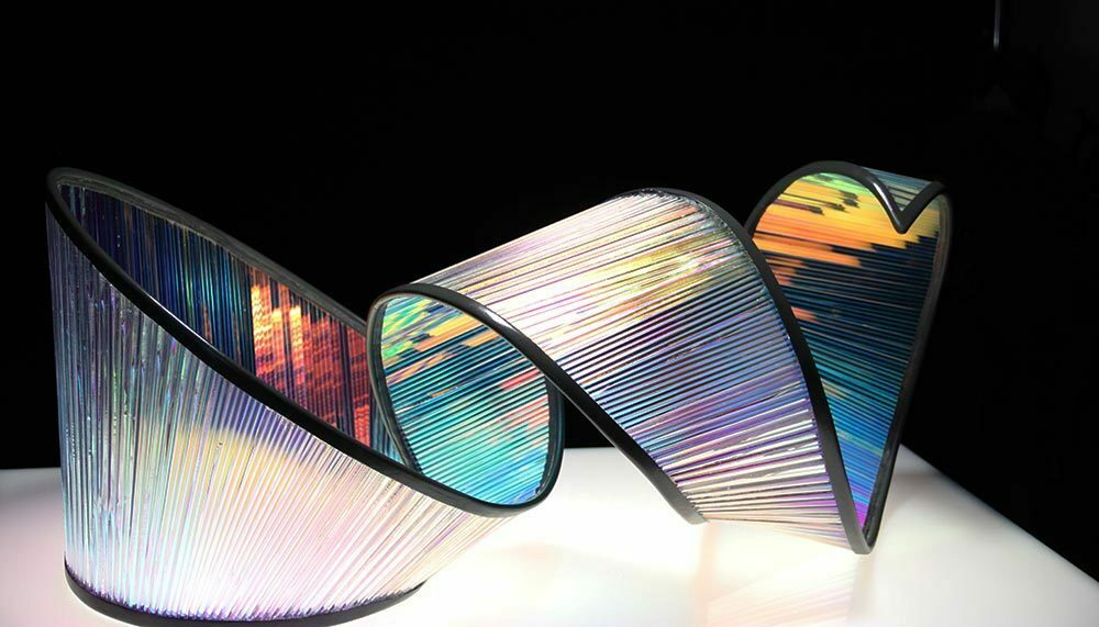 Her interpretation of the all-new Lexus LS resulted in a twisting, asymmetric spiral of narrow glass strips set within a metal frame. The iridescent glass panes create a kaleidoscopic effect, accentuated still further by the piece’s undulating form.