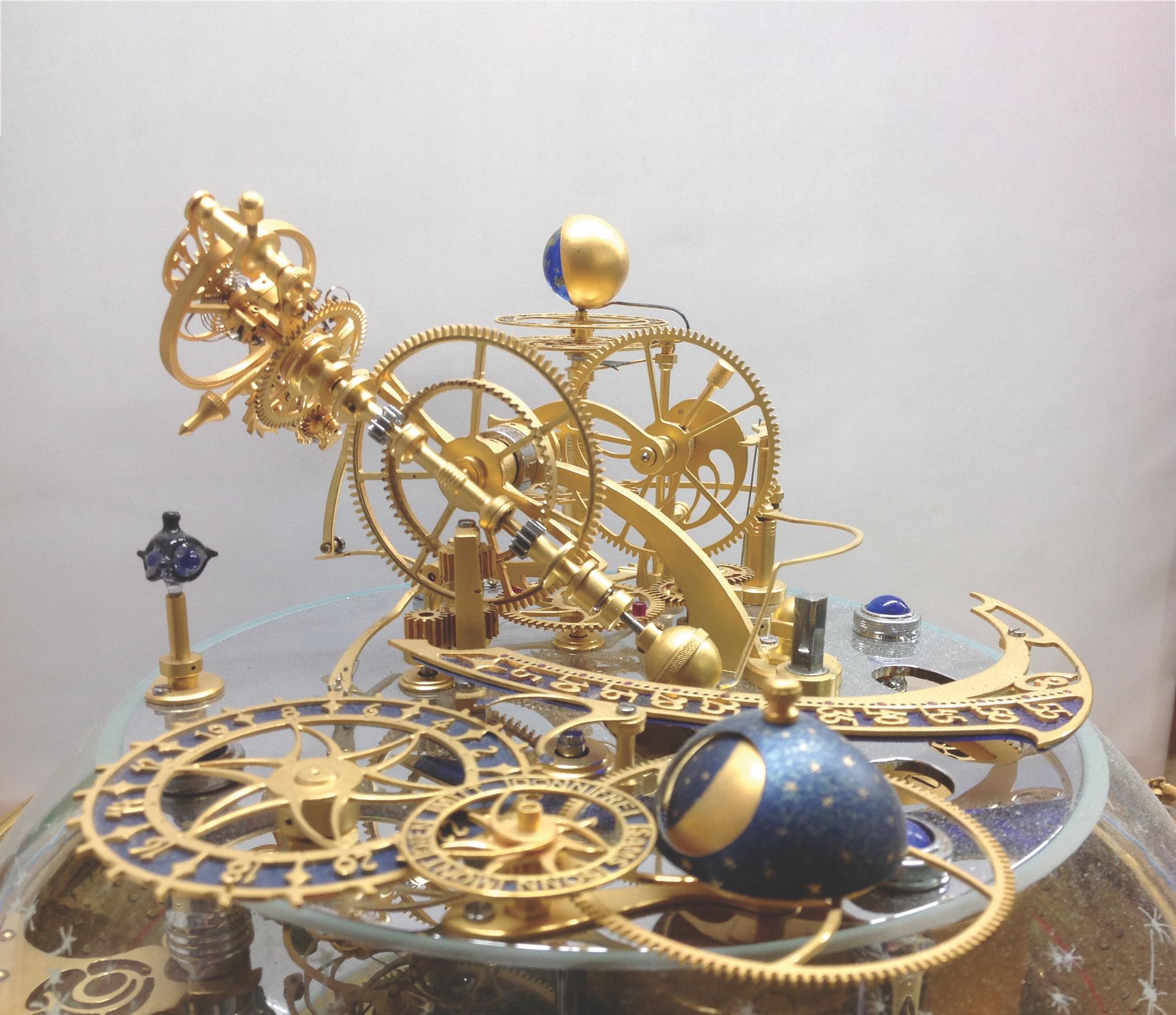 Another self-taught innovator, Miki Eleta worked as a musician and a soccer coach before taking an interest in kinetic clockworks. The Swiss-based maker’s one-of-a-kind, handmade pieces have the outward appeal and complicated movement of old-world clocks but with whimsical sci-fi touches.