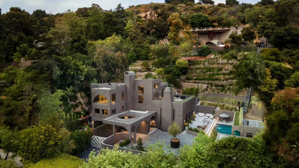 The home was designed by AD100 designers Ramin and Pamela Shamshiri of Studio Shamshiri, an L.A.-based firm known for their layered, bohemian aesthetic that’s rich in colors and textures. The home spans almost 12,600 square feet with eight bedrooms and nine full bathrooms, plus a couple of two powder rooms. Backed by a hillside etched with tiered gardens bursting with lush foliage, mature trees, and native shrubs, the serene oasis hides behind a sculpted, multi-level facade made from board-formed concrete with geometrical steel-frame windows and openings.