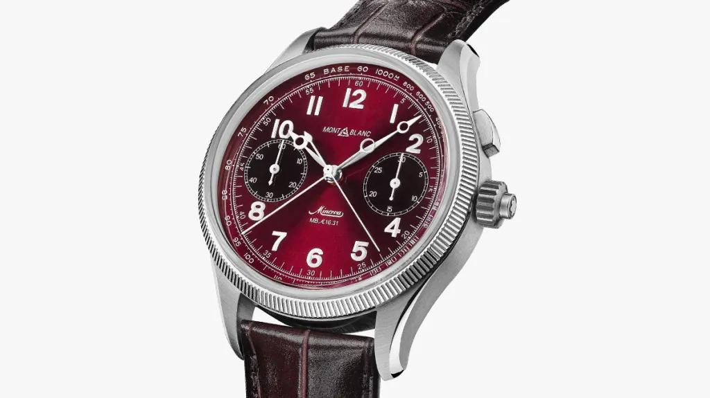 Minerva, Montblanc’s elite workshop in Villeret, Switzerland, specialized in chronographs, particulary for the military, in the 1920s and ’30s. One of them, a monopusher split second chronograph, was the inspiration for this 100-piece limited edition. Even the movement—the manually wound, monopusher, split second chronograph MB M16.31—was inspired by a Minerva chronograph caliber from 1909, along with its successor, developed in the 1930s. The lumed Arabic numerals and hands are typical vintage military in design. The burgundy dial is a nice modern touch, dark enough for contrast and an ideal color to distinguish a limited edition.