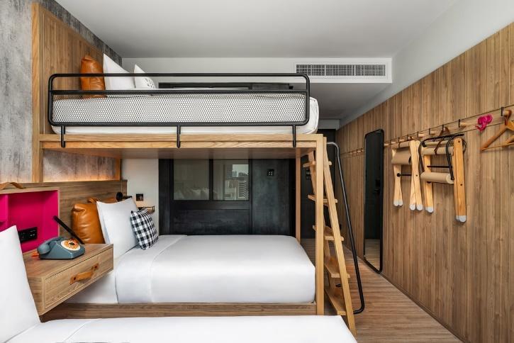 Moxy Loft Room: Designed for 3–4 guests, this elevated room type features bold interiors, peg walls, and a smart layout ideal for families or squads. Includes 1 queen bed and 2 bunk beds with built-in USB sockets, plus extra space to play or unwind.