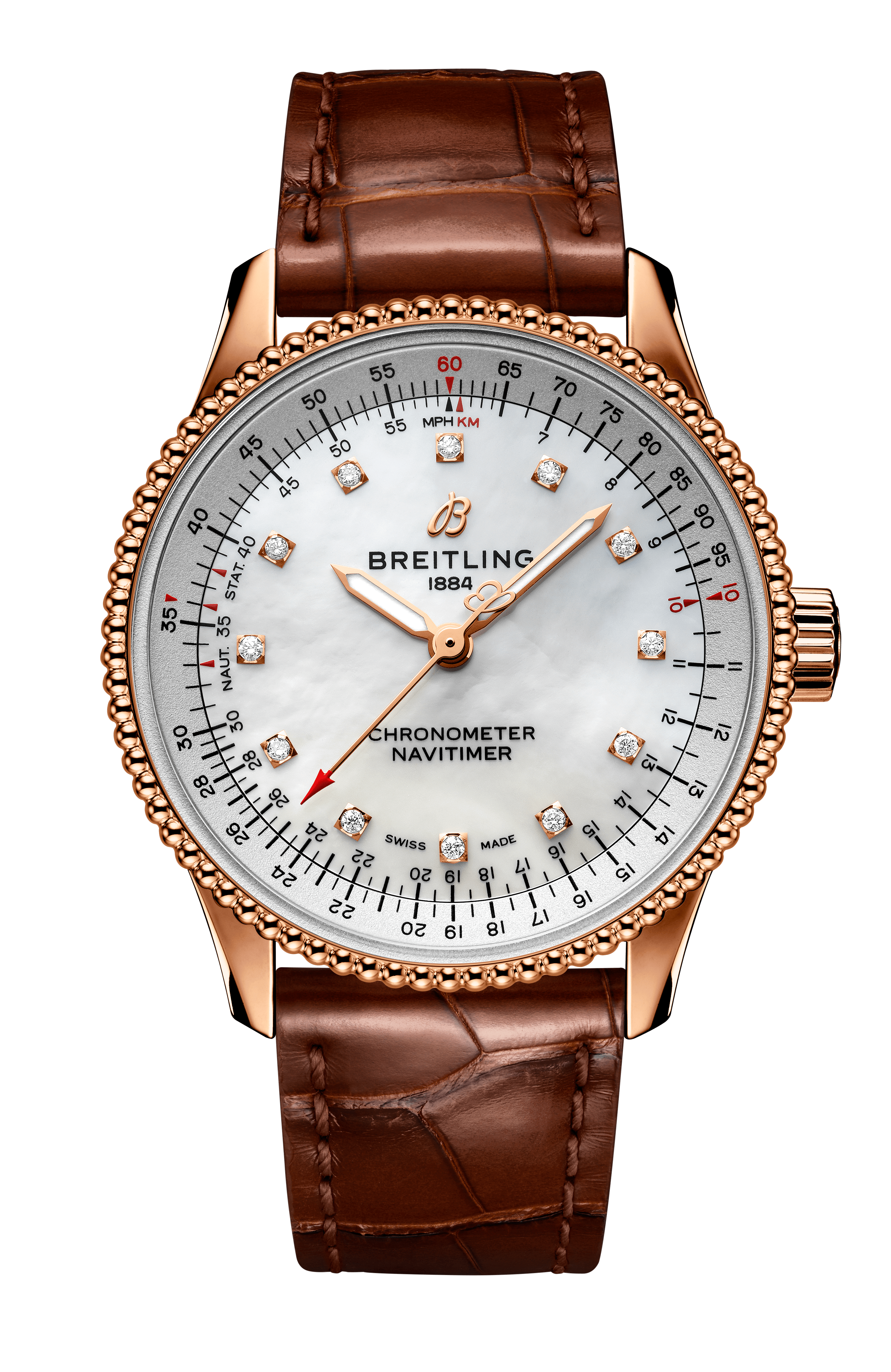 - 02 Navitimer Automac 35 in 18k redgold with a white mother of pearl dial ลุคเท่คลาสสิกด้วยหน้าปัดมุกสวยงามสง่า ที่มาพร้อมสายหนังจระเข้สีน้ำตาล