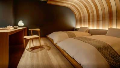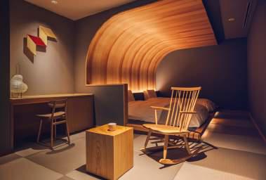 The modern headboard that covers the bed in a KAI Signature room is made with “mageki", a renowned wood bending technique from Hida. The technique of “Suki-urushi" used in the making of “Hida-Shunkei", a lacquerware from Takayama in Gifu, is used to bring out the grain of the wood in the wall arts that adorn the rooms.