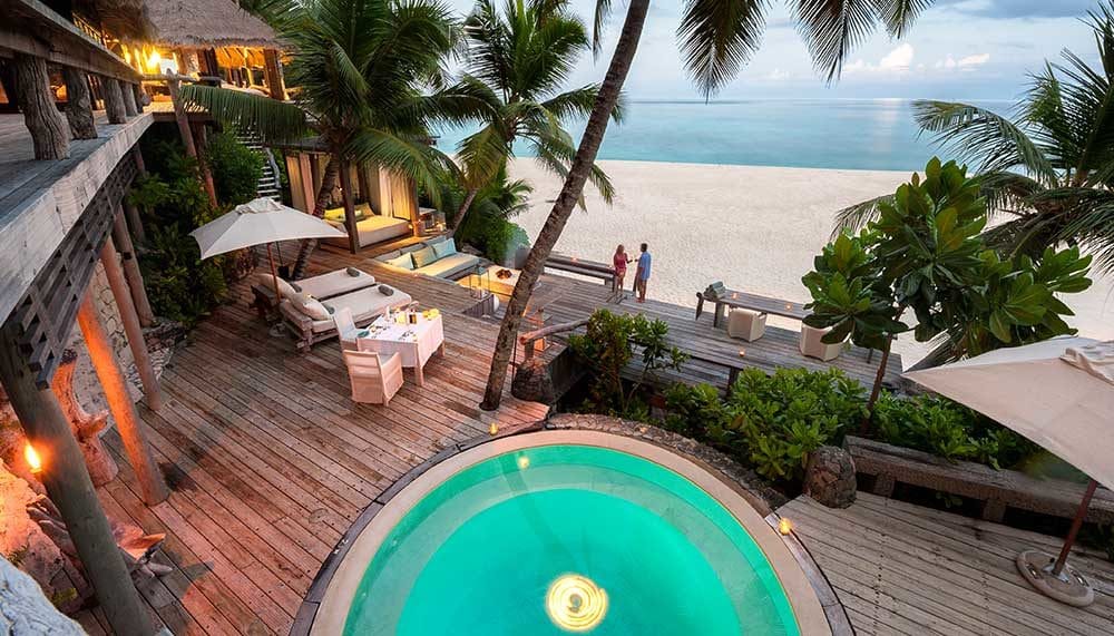 The island with no more that 11 guest villas is cosseted by palm-fringed sugar-white beaches and filigree reefs teeming with technicolour marine life. Three granite outcrops rise majestically from the kaleidoscope of jewel-toned waters, inviting sunrise hikes for glorious views.