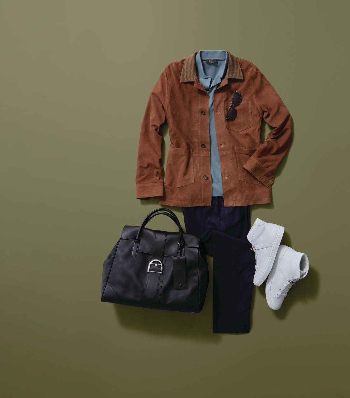 A ribbed collar lends a note of refinement to the hardworking chore coat (ditto the Italian goat suede). Add some kick with clean white high-top sneakers, which will age with as much character as well-loved loafers.