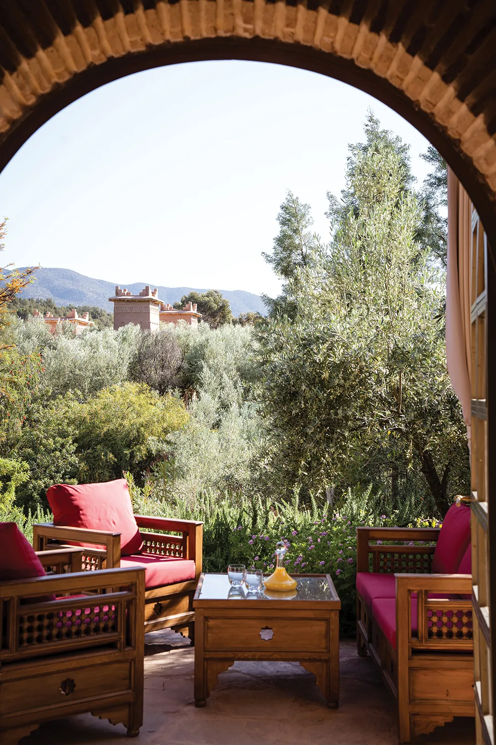 Each suite at Olinto feels like a separate home, housed in its own pavilion and decorated with vaulted ceilings, rich color palettes, and intricately carved and painted doors; three have private heated pools. As appealing as the interiors are the private rooftop gardens, complete with sunbathing spots, and the wide- open patios, which overlook the olive trees, cypress pines, fragrant roses, and other lushness in the gardens. It’s all set against the ideal backdrop: the purple-hued Atlas Mountains ranged along the horizon. Doubles from about $760