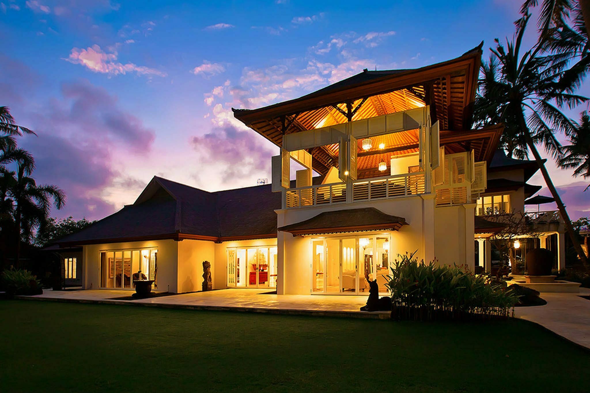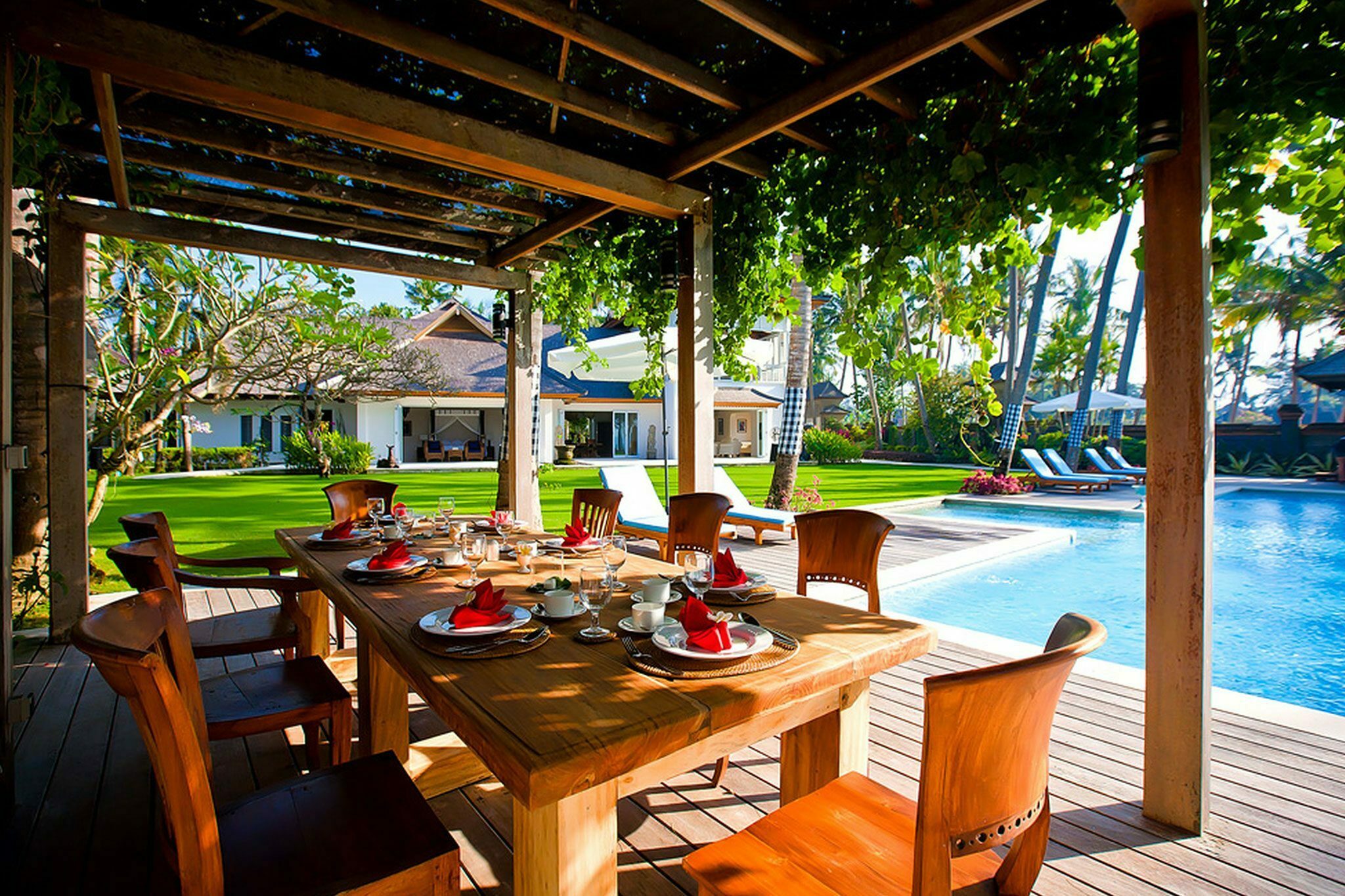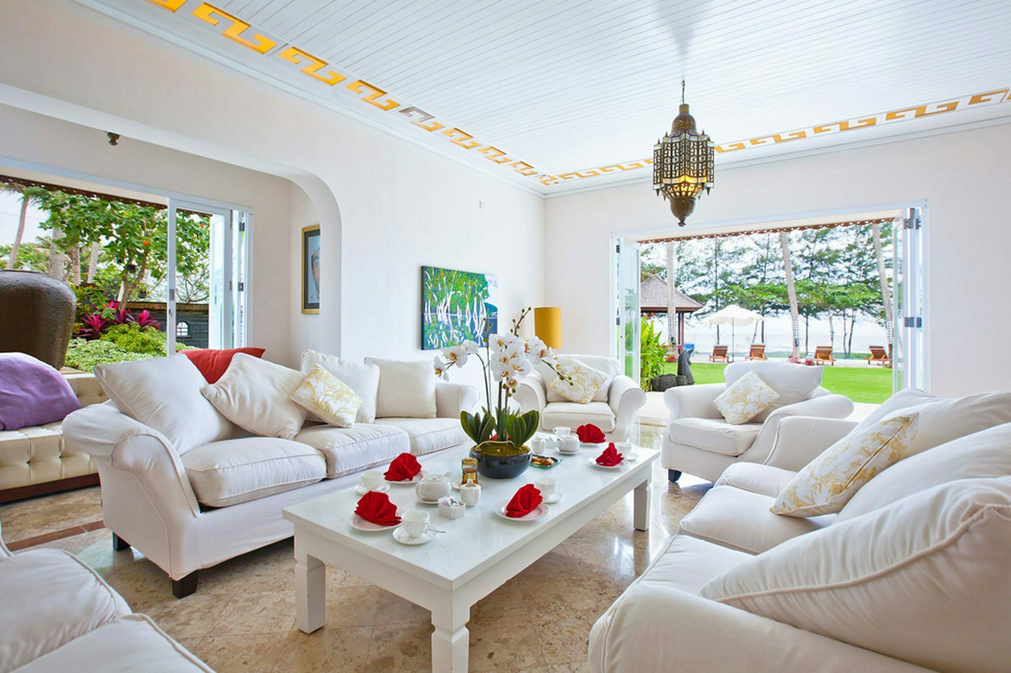 The classic colonial-style villa sits on 5,000sqm of land and stuns with a manicured front lawn, two outdoor bales for dining and socialising, a stone terrace, 17-m pool overlooking the beach, and six bedrooms across two levels. There’s even a separate spa villa on site, for where guests wish to indulge and ease sore muscles.