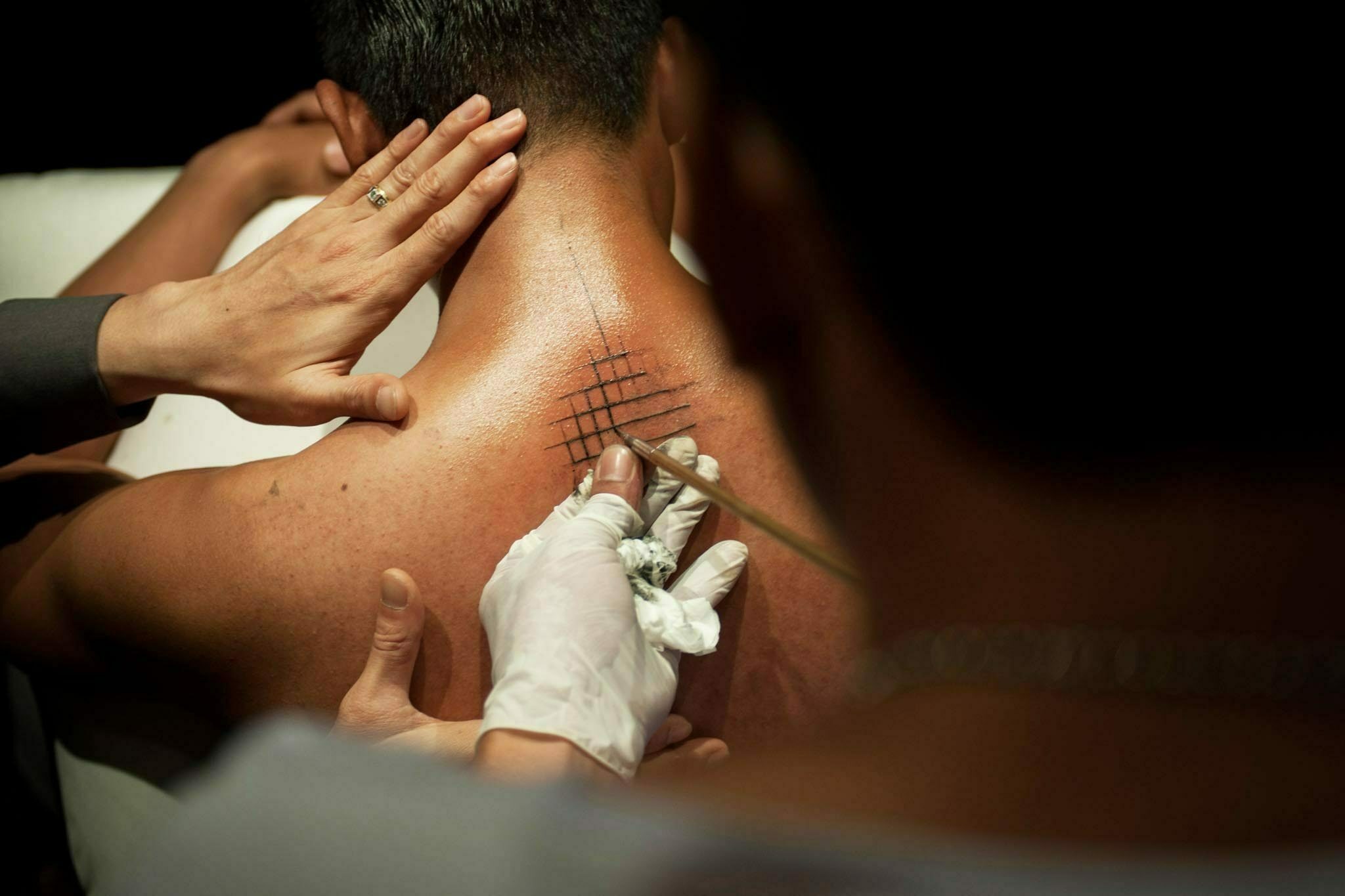 A Sak Yant is a sanctified symbol believed to have magical powers that can ward off evil, protect the bearer and bring good fortune. It is created not with a tattoo gun but by piercing the skin repeatedly using a khem sak, which is a long metal spike.