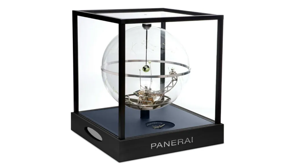 And now for something completely different: Meet the Jupiterium — a Panerai timepiece utterly devoid of military dive watch overtones! Housed in a 75 cm x 86 cm glass case and weighing some 110 kg (roughly 242 lbs.), this is no wrist-worn tool watch, but rather, a magnificent planetary installation inspired by the discoveries of 17th century Italian astronomer Galileo Galilei, whose observations negated the geocentric theory and ushered in the modern era of heliocentric thinking. Within its planetarium-like confines, the Earth occupies the center of a ring of planets around which the positions of the Sun, Moon, Jupiter, and the latter’s four satellites can be observed.