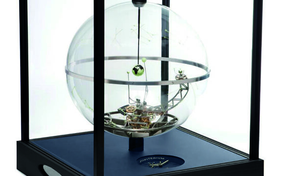 And now for something completely different: Meet the Jupiterium — a Panerai timepiece utterly devoid of military dive watch overtones! Housed in a 75 cm x 86 cm glass case and weighing some 110 kg (roughly 242 lbs.), this is no wrist-worn tool watch, but rather, a magnificent planetary installation inspired by the discoveries of 17th century Italian astronomer Galileo Galilei, whose observations negated the geocentric theory and ushered in the modern era of heliocentric thinking. Within its planetarium-like confines, the Earth occupies the center of a ring of planets around which the positions of the Sun, Moon, Jupiter, and the latter’s four satellites can be observed.