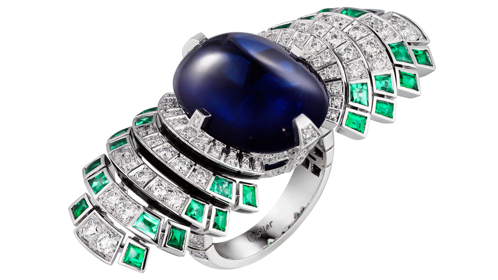 Dubbed Sixième Sens, or Sixth Sense, Cartier’s latest high- jewelry collection incorporates nature’s most beautiful stones into designs inspired by optical illusions. Featuring a 21.51-carat cabochon- cut sapphire, the top of the Parhelia ring seen here detaches to be worn as a brooch. The diamonds and emeralds fanning out from the center stone are arranged to evoke the peacocks Louis Cartier favored in his 1920s designs.
