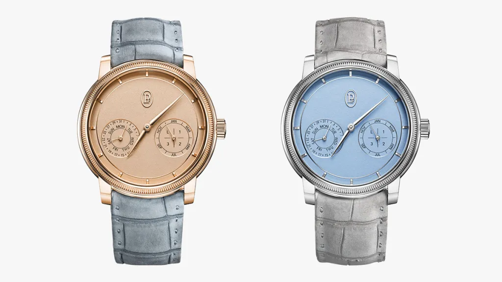 Measuring 40.6mm in diameter and just 10.9mm tall, the Toric QP’s thick polished lugs and beautiful fluted bezel surround a handsome, hand-grained dial in powder blue (platinum) or gold tone (rose gold). The movement, which is largely constructed of rose gold and features Côtes de Fleurier finishing, is a dual-barrel design boasting 265 components, a 4 Hz beat rate, and an impressive 60-hour power reserve. Visible via a sapphire caseback, it powers dual sub-registers: Day and date are displayed at 8 o’clock, while month and leap year are shown at 4 o’clock. Add in the time, and you’ve got the makings of one of the most streamlined and elegant QPs of the past few years.