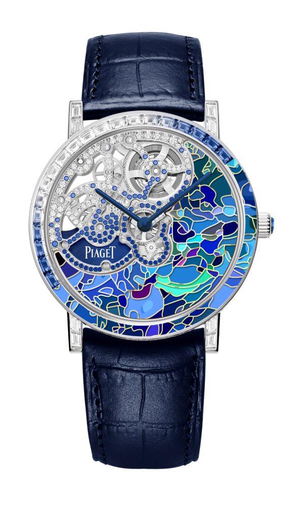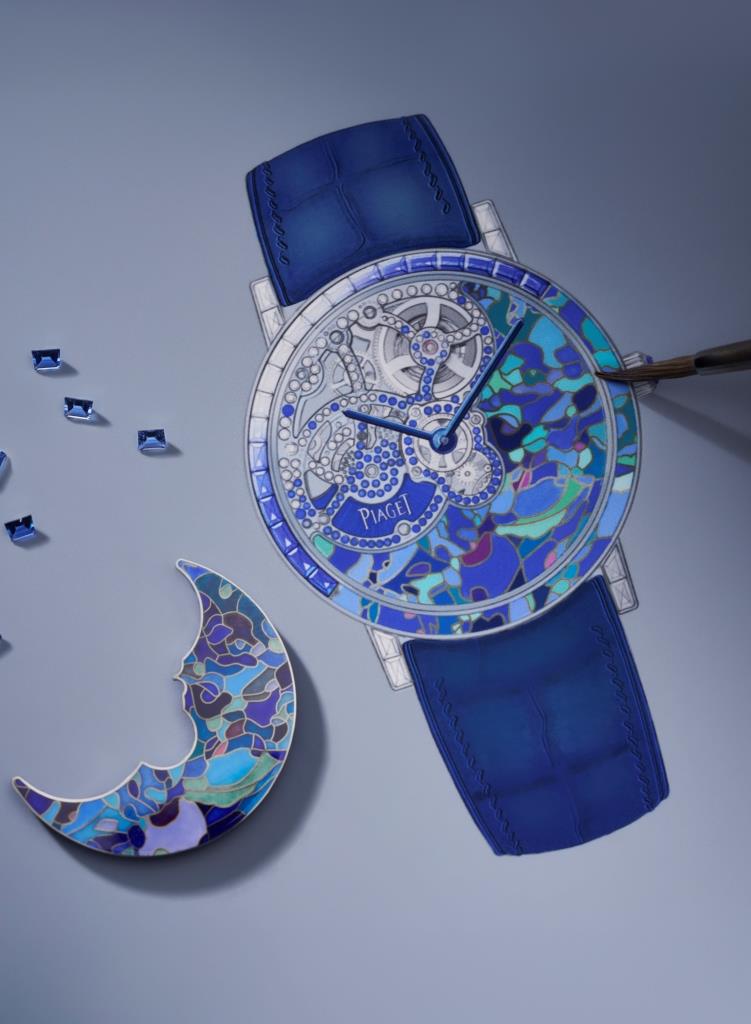 After constantly pushing the boundaries of what is possible in crafting gem-set skeleton movements and Métiers d’Art creations, it was time for the Ateliers de l’Extraordinaire to blend both savoir-faires into one. Staying true to Georges- Édouard Piaget’s motto, “Always do better than necessary", which has inspired Piaget’s artisans for over 150 years, the Maison entrusted its precious skeleton, set with diamonds and blue sapphires, to the renowned enamel artist Anita Porchet, Piaget’s loyal partner since 2006.