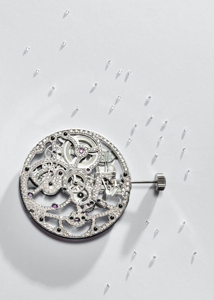 This new creative playground inspired these talented artisans to express couture allure through jewellery. The two worlds continued to intertwine, with even the architectural lines of the Maison’s skeleton movements becoming adorned with a shower of dazzling precious stones. Piaget’s attention to detail extended to gem-setting each corner and each slight curve of this signature gold self-winding Manufacture movement, the 1200D, recently optimised to become the 1201D1.