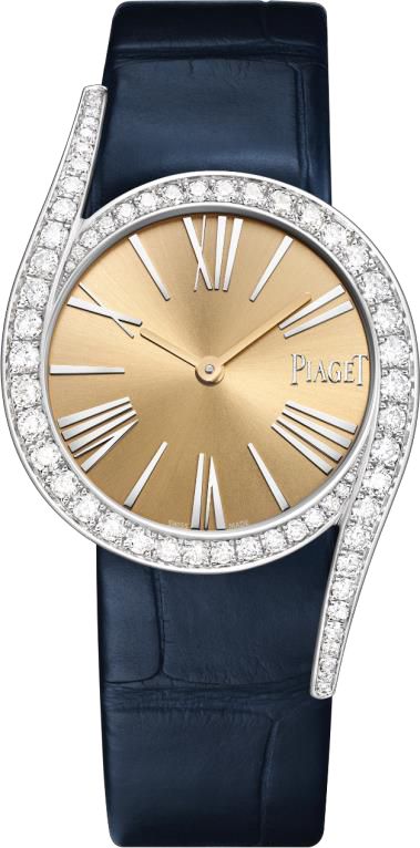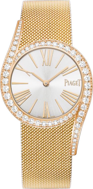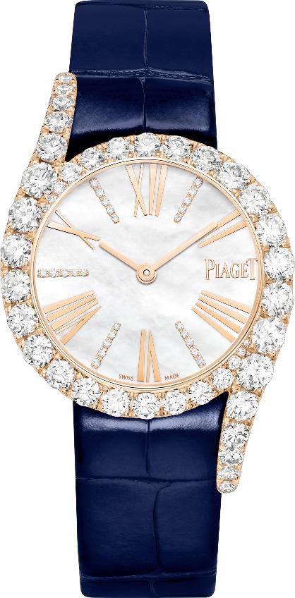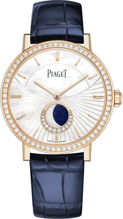 36 mm. Case in 18K rose gold set with 62 brilliant-cut diamonds (approx. 0.87 ct). Dial set with 12 brilliant-cut diamonds (approx. 0. 07 ct) and a white mother-of-pearl base plate (approx. 3.23 cts). Sapphire crystal case back. Interchangeable strap. 580P Altiplano Manufacture automatic mechanical movement with moon phases.