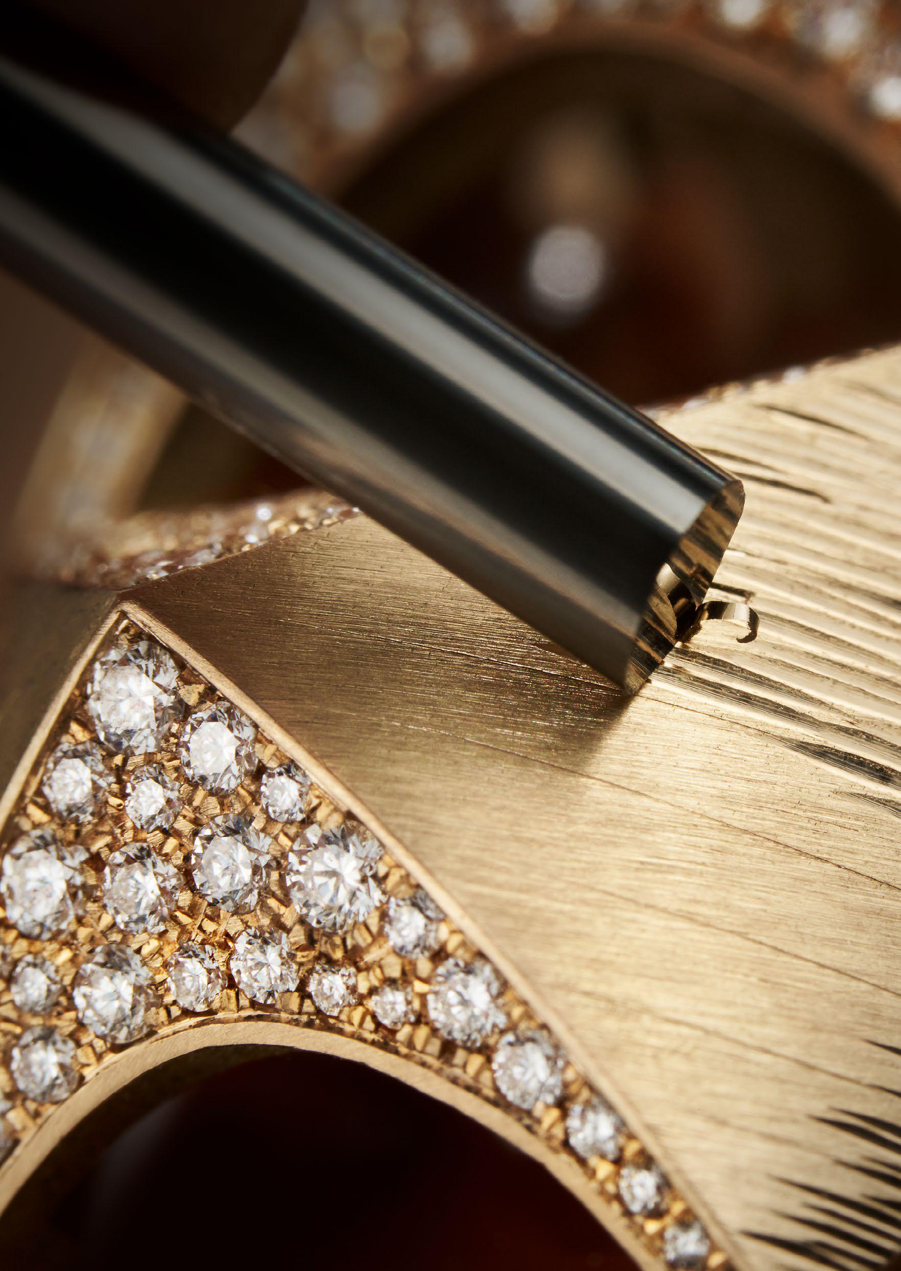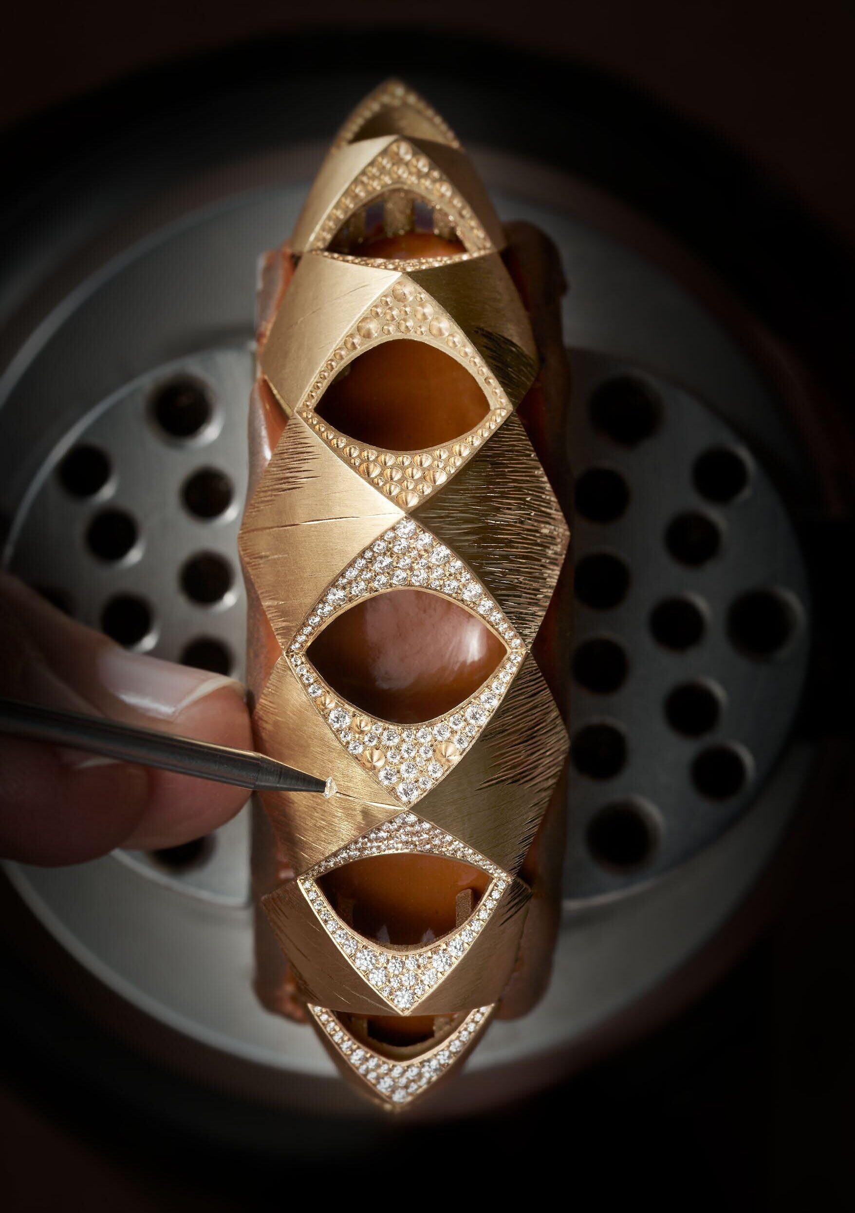 Beneath these chromatic sensations, dizzying panoramic curves are interlaced with gold, proclaiming the power of sumptuous detail. In the High Jewellery category, a double ring, which nestles between the fingers creating a new way to wear, and an opulent cuff are key pieces displaying the Maison’s narrative inspirations. Their lines are reworked by hand to reproduce the graphic criss-crossing pattern of the emblematic ‘Decor Palace’ gold engraving technique, paying homage to the Maison’s savoir-faire. This goldsmithing mastery enhances the radiant intensity of the gemstones.