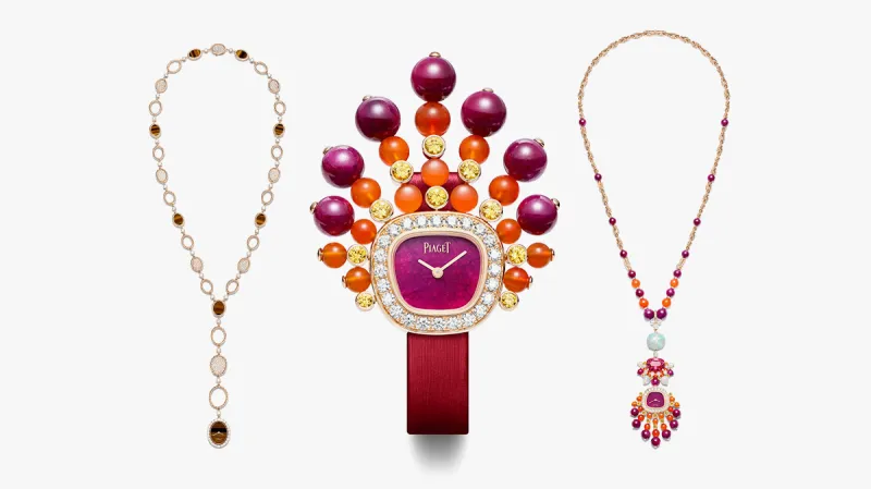 Piaget’s new one-of-a-kind sautoir offers three spectacular looks in one. The creation begins as a dramatic tiered necklace strung with a 17-carat cushion-cut pink spinel, a 12.57-carat white opal and a pendant watch whose vivid red dial is fashioned from ruby root surrounded by yellow and white diamonds. Once you unclip the timepiece, however, you’re left with a sautoir and a cocktail watch. Now that’s the kind of swing shift we’re talking about.