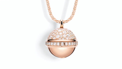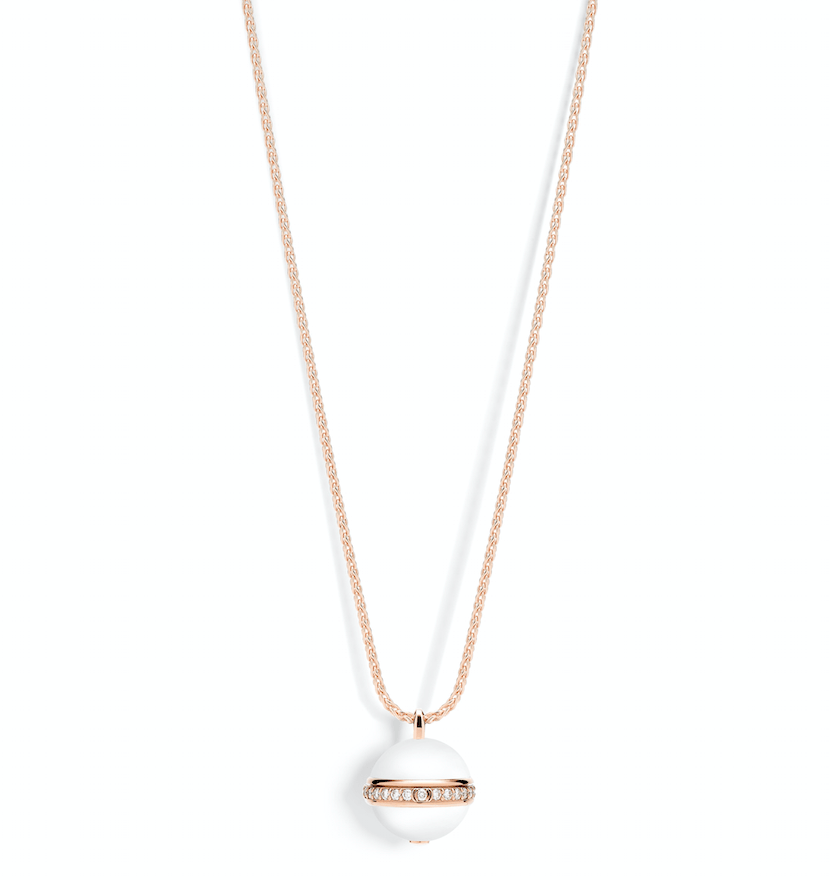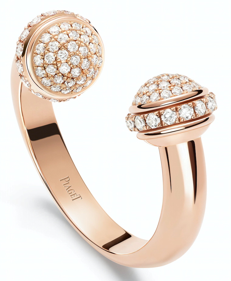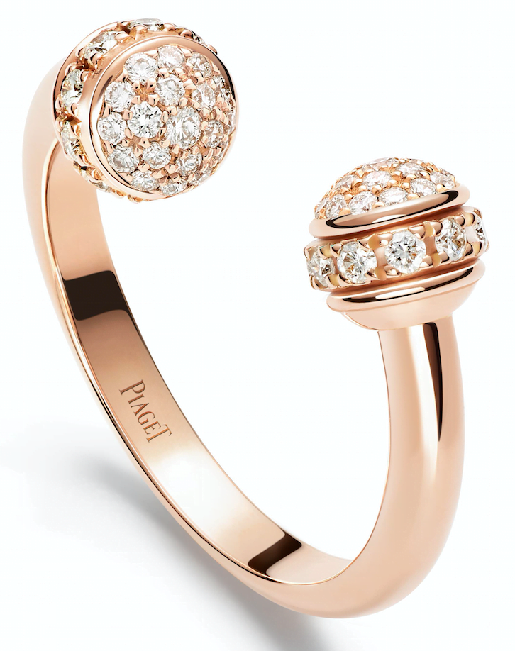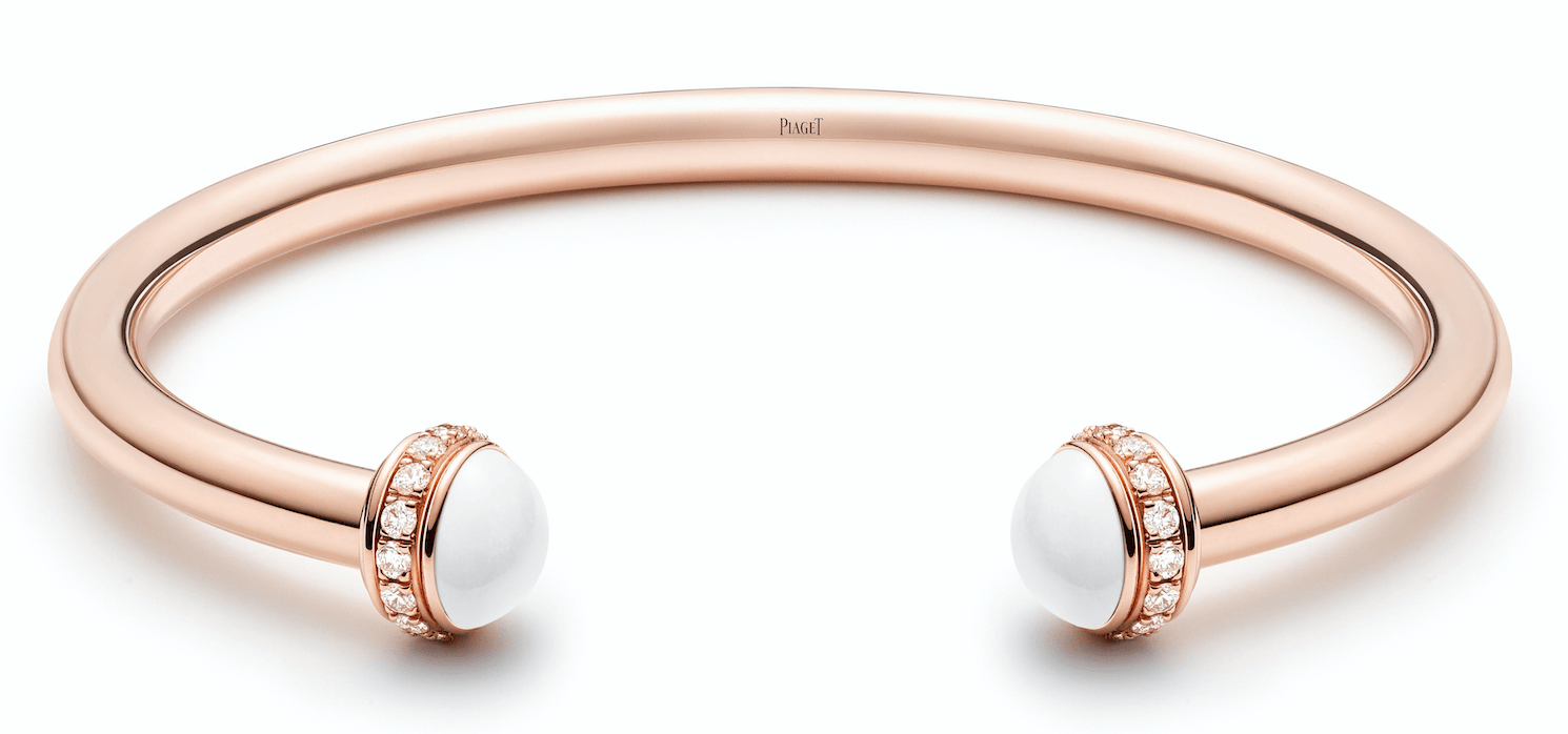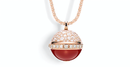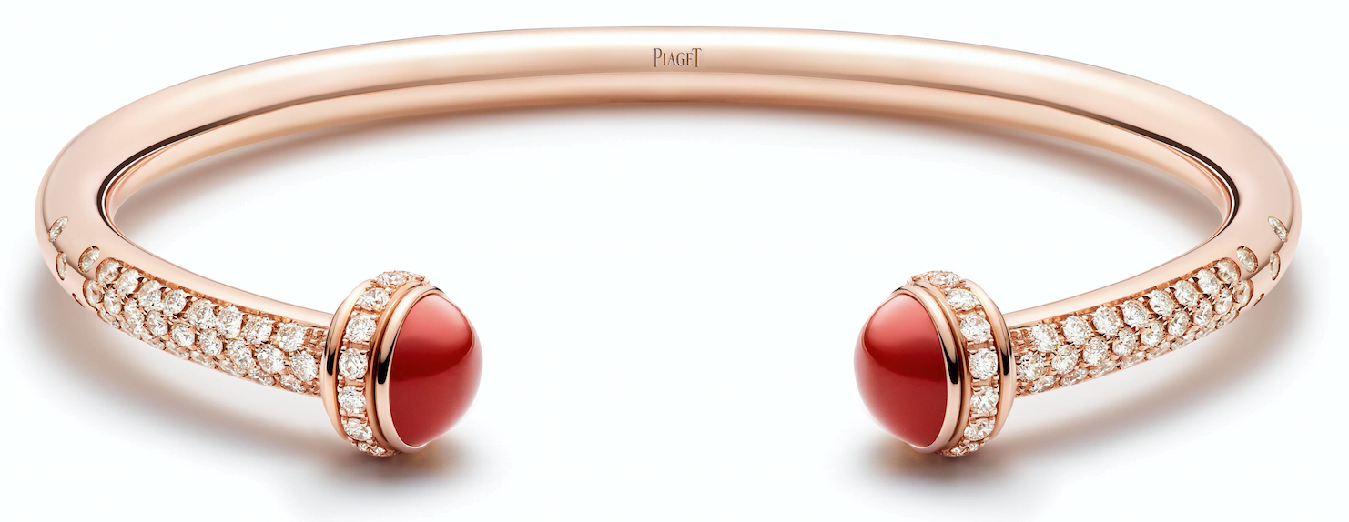 In an additional ode to the timelessness of gold and diamonds, Piaget offers a new pendant is rose gold, with half the sphere ‘snow-set’ in diamonds. The signature paved rotating band is embellished with the delicate touch of an additional half-moon-set diamond. A red carnelian rose gold pendant with paved half sphere is also available for those who love the audacious, fiery tones of this gem. The Maison also presents a medium rose gold bangle with carnelian cabochons, diamonds turning rings and paved with diamonds on the two sides of the bracelet.