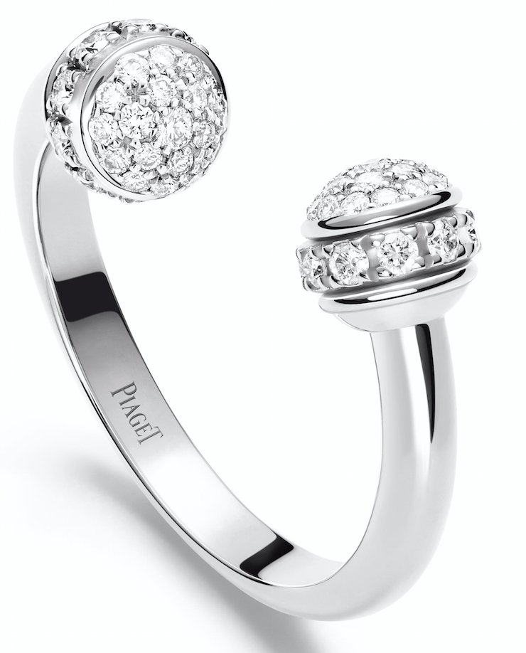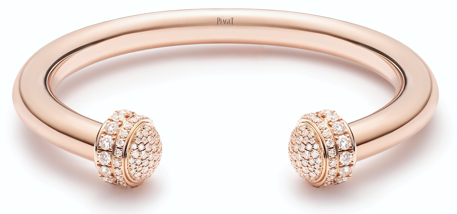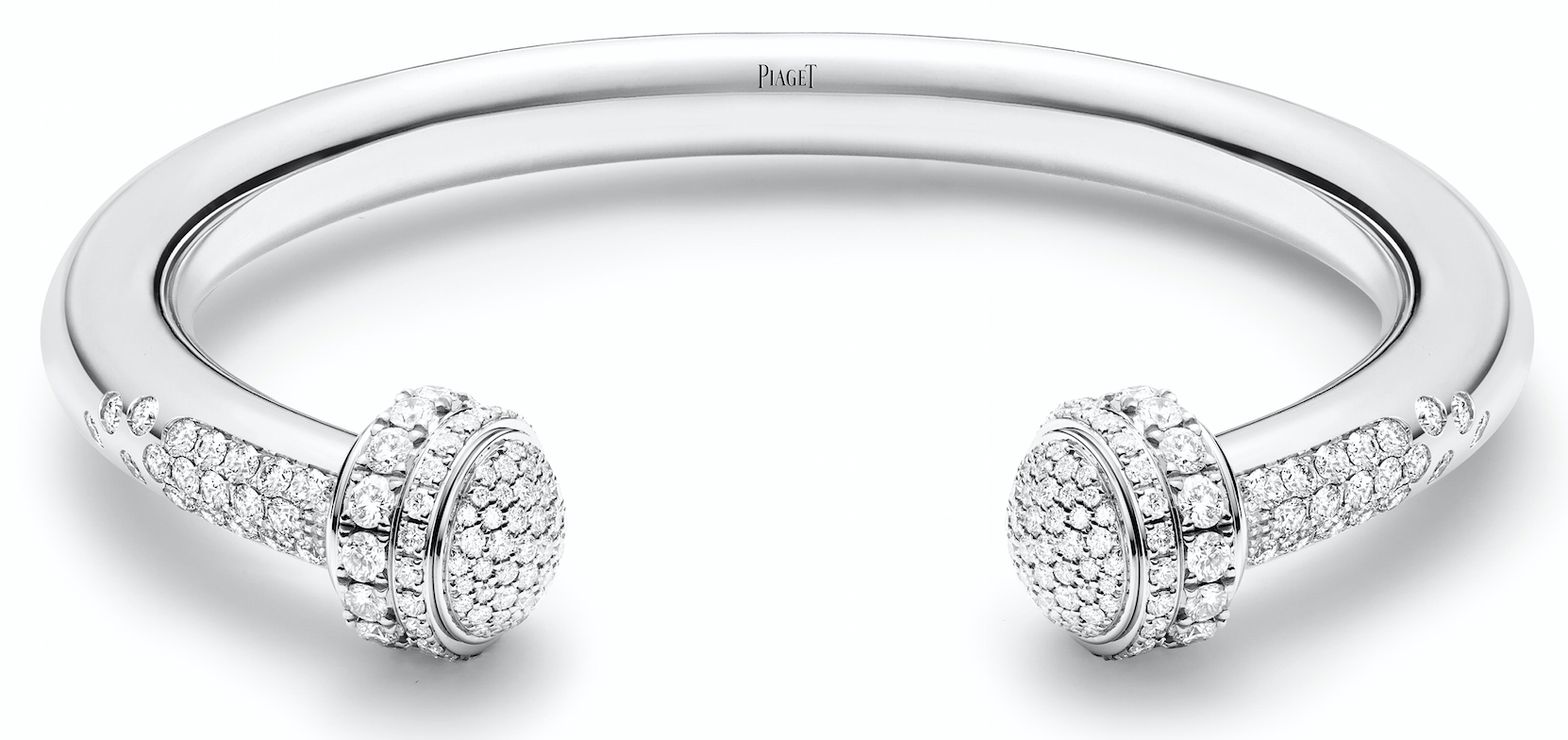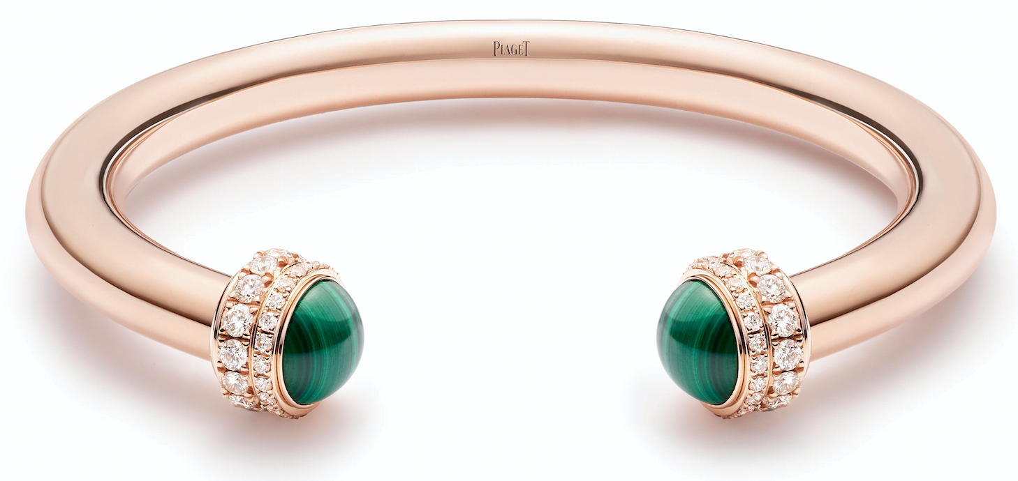 For a bolder look, Piaget is adding three large bangles that still maintain their clasp-free signature flexibility, a technical marvel in itself. The first one features malachite alluring green cabochons that contrast so vividly with the rose gold. The other two bangles – in rose and white gold – feature fully paved cabochon that catch the light. The white gold bangle is spotted with diamonds on the bracelet for even more shine! These three models feature four turning paved bands.