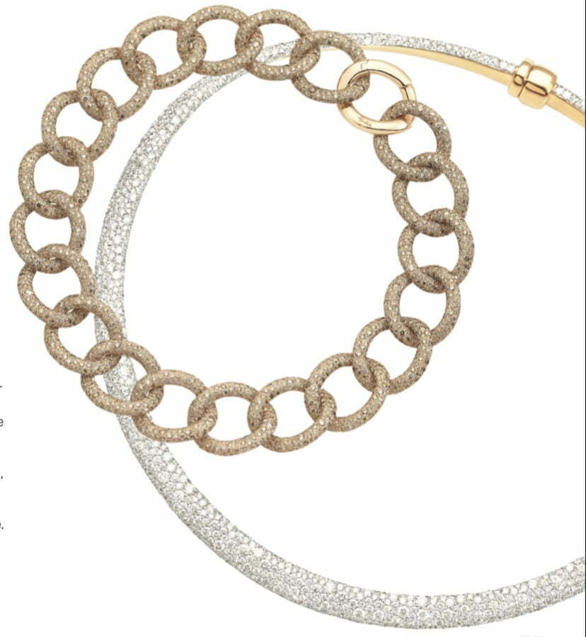 สร้อยคอที่ประดับประดาและหุ้มด้วยเพชรสีน้ำตาล จากแบรนด์ Pomellato La Gioia ดูดีมีสไตล์เช่นเดียวกับกางเกงยีนส์ ไทสีดำและชุดราตรี สร้อยคอมีทั้งหมดสามชั้นด้วยกัน ได้รับการออกแบบและประดิษฐ์อย่างวิจิตรบรรจง ประดับด้วยหิน Nudo อันเป็นเอกลักษณ์ของนักอัญมณีของชาวอิตาลีและยังสามารถใช้งานได้หลากหลายอย่างหน้าเหลือเชื่อ ราคา 6,950 ถึง 276,000 เหรียญสหรัฐ