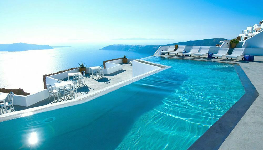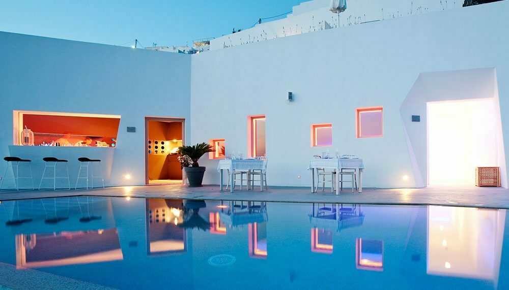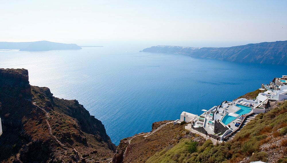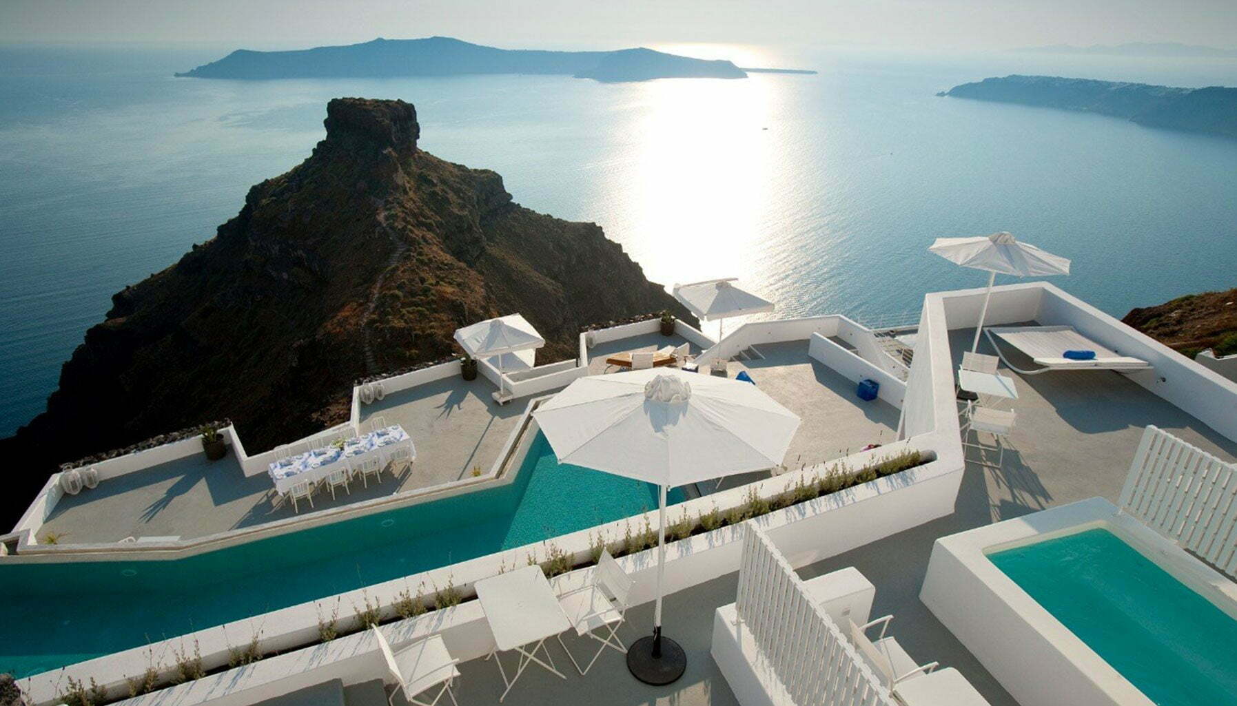 Carved into a cliff on the Greek island of Santorini, just above the volcanic caldera crater, the iconic Grace Santorini hotel features all-white interiors and concrete floors reminiscent of traditional Greek homes. Each of its 21 rooms has ocean views and a network of zigzagging paths lead to the property’s infinity-edge pool.